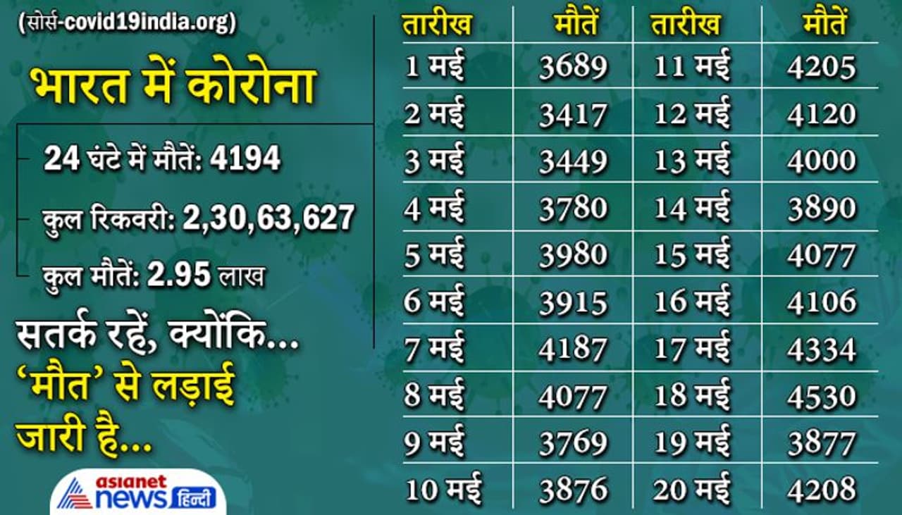 पिछले 16 मई से लगातार संक्रमण की स्पीड पर ब्रेक लगा हुआ है। इस महीने में सिर्फ 5 से 8 मई तक का दौर ऐसा रहा, जब एक दिन में 4 लाख से ऊपर केस आए। वहीं बाकी दिनों में 3 लाख से अधिक केस आए। लेकिन अब केस 3 लाख से नीचे चले गए हैं। पिछले 24 घंटे में  2.57 लाख नए केस मिले हैं, जबकि 3.57 लाख लोग ठीक हुए। लेकिन असली लड़ाई अभी 'मौत' से है। यह संख्या अभी भी 4000 के करीब जा रही है।