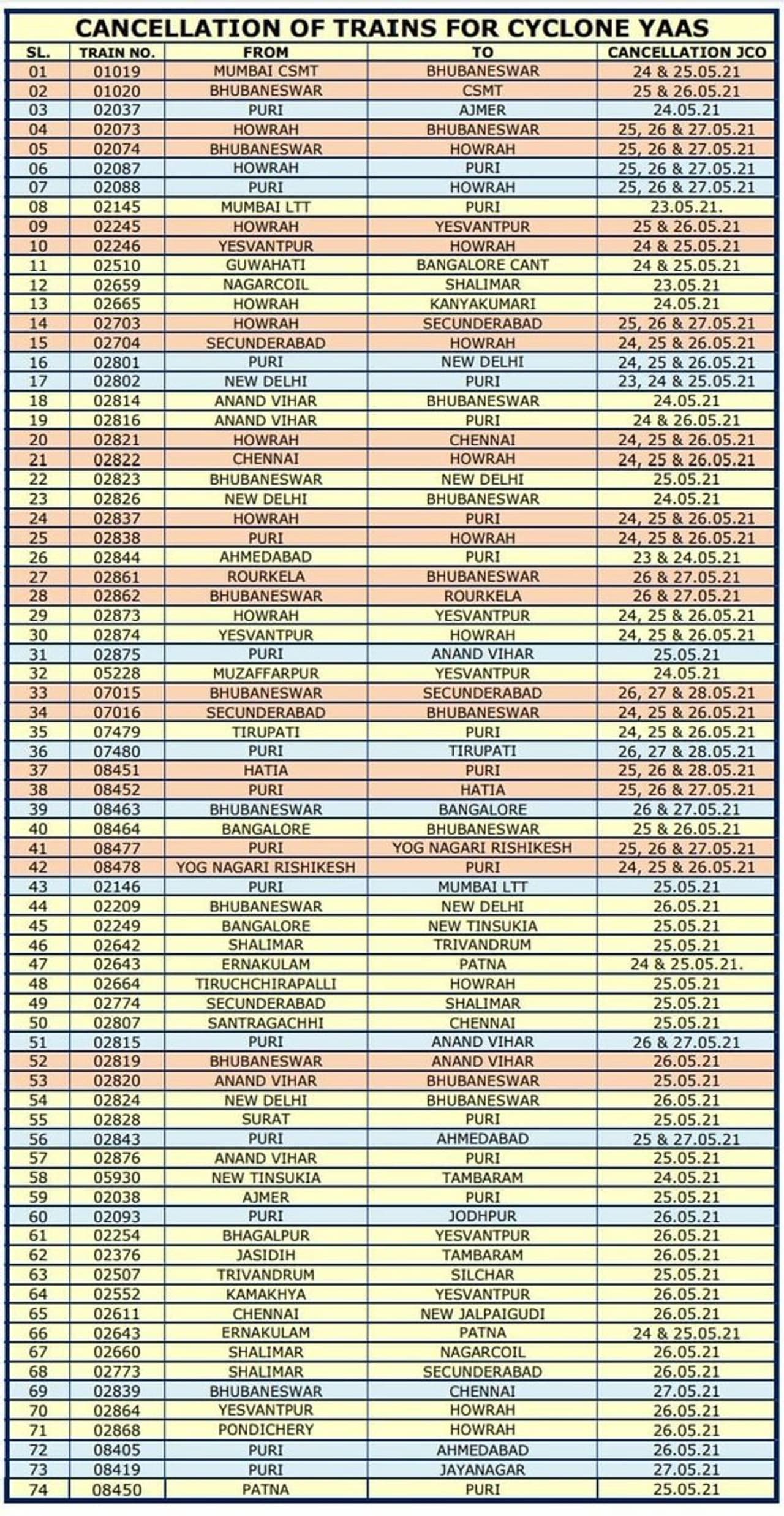 अंडमान के उत्तरी भाग और पूर्वी-मध्य बंगाल की खाड़ी में बने चक्रवाती तूफान यास के चलते दक्षिण रेलवे के बाद पूर्वी रेलवे ने भी कई ट्रेनों को रद्द कर दिया है। इस तूफान का असर ओडिशा और पश्चिम बंगाल में अधिक रहेगा। जबकि झारखंड आदि राज्यों में भी असर पड़ सकता है। प्रधानमंत्री भी तूफान से निपटने मीटिंग ले चुके हैं। आपदा प्रबंधन टीमें, सेना आदि भी तैयार है।