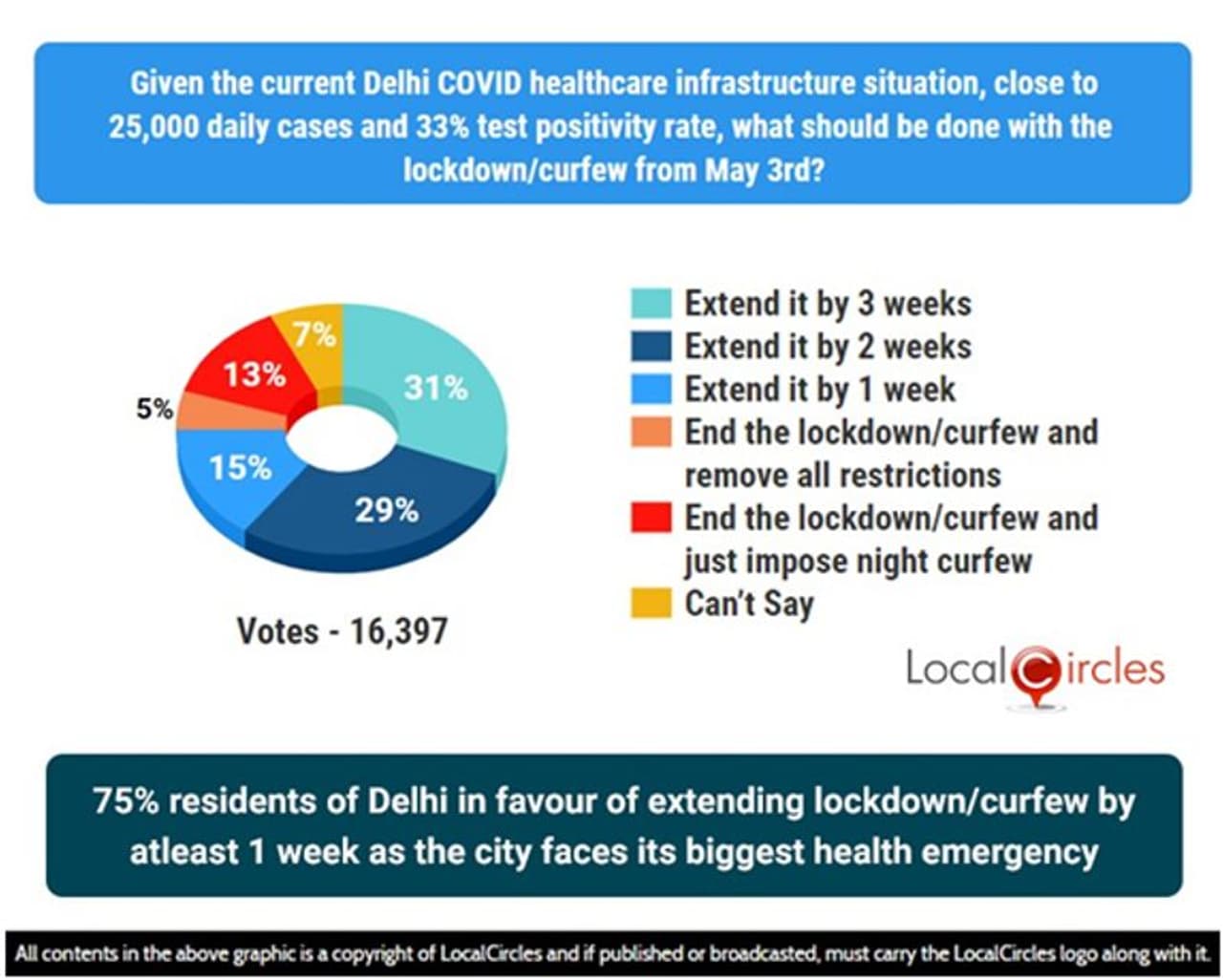 लोकल सर्किल ने दिल्ली के हालात पर एक सर्वे कराई। सर्वे में भाग लेने वाले 75 प्रतिशत ने कहा कि लाॅकडाउन बढ़ाया जाना चाहिए। कम से कम एक सप्ताह ही क्यों न बढ़ाई जाए लेकिन अभी कुछ भी न खोली जाए। सर्वे के अनुसार 31 प्रतिशत चाहते हैं कि तीन सप्ताह से कम का लाॅकडाउन न बढ़ाया जाए। जबकि 29 प्रतिशत चाहते हैं कि 2 सप्ताह तक लाॅकडाउन बढ़े। जबकि पंद्रह प्रतिशत का मत है कि एक सप्ताह का लाॅकडाउन एक्टेंशन हो। केवल 5 प्रतिशत लोगों का कहना था कि लाॅकडाउन नहीं बढ़ाया जाना चाहिए। इस सर्वे में 16397 लोगों ने भाग लिया।