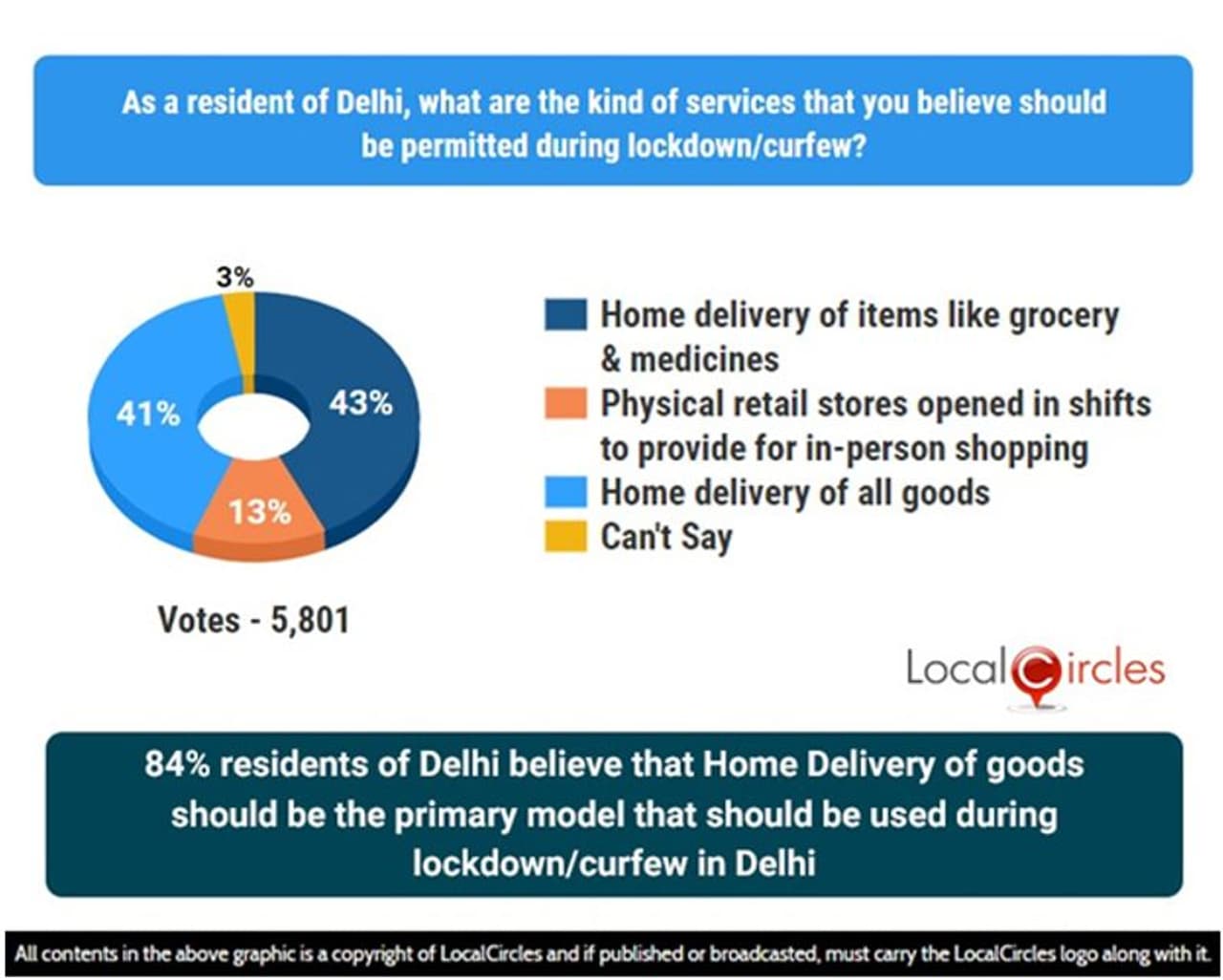 कोविड हेल्थ इमरजेंसी से जूझ रही दिल्ली के लोगों का कहना है कि लाॅकडाउन को बढ़ाया जाए और होम डिलेवरी को प्राथमिकता दी जाए। 84 प्रतिशत लोगों का कहना है कि प्रत्येक सामानों की होम डिलेवरी व्यवस्था हो और लोग घरों में ही रहें। इससे संक्रमण का खतरा कम होगा। सर्वे में 43 प्रतिशत लोगों का कहना था कि ग्रोसरी व मेडिकल के सभी सामानों की होम डिलेवरी व्यवस्था हो जबकि 41 प्रतिशत का कहना था कि हर एक सामान की होम डिलेवरी व्यवस्था होनी चाहिए। केवल 13 प्रतिशत का कहना है कि दूकानों पर जाकर सामान खरीदने की व्यवस्था सुनिश्चित होनी चाहिए। इसके लिए शिफ्ट तय हो। लेकिन 3 प्रतिशत कुछ भी नहीं कहे। इस सर्वे में 5801 लोगों ने अपनी राय दी है।