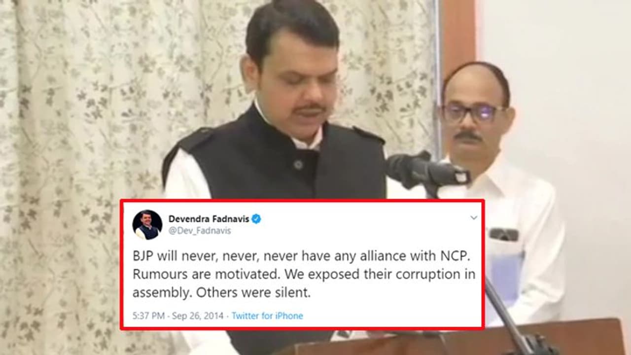 26 सितंबर 2014 को ट्वीट किया था, "भाजपा कभी भी एनसीपी के साथ सरकार नहीं बनाएगी। यह सब अफवाहें हैं। हमने विधानसभा में उनके भ्रष्टाचार को उजागर किया। दूसरे चुप थे।"