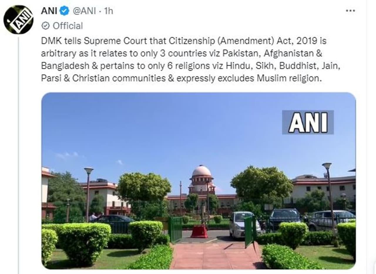 सुप्रीम कोर्ट में दिए गए हलफनामे में DMK ने कहा है कि नागरिकता संशोधन अधिनियम (CAA) सिर्फ 3 देशों पाकिस्तान, अफगानिस्तान और बांग्लादेश के लिए है। इसमें केवल हिंदू, सिख, बौद्ध, जैन, पारसी और ईसाई समुदाय को ही शामिल किया गया है और मनमाने तरीके से मुस्लिम समुदाय के लोगों को बाहर रखा गया है। इसके अलावा CAA में तमिल शरणार्थियों को भी कानून के दायरे से बाहर रखा गया है।