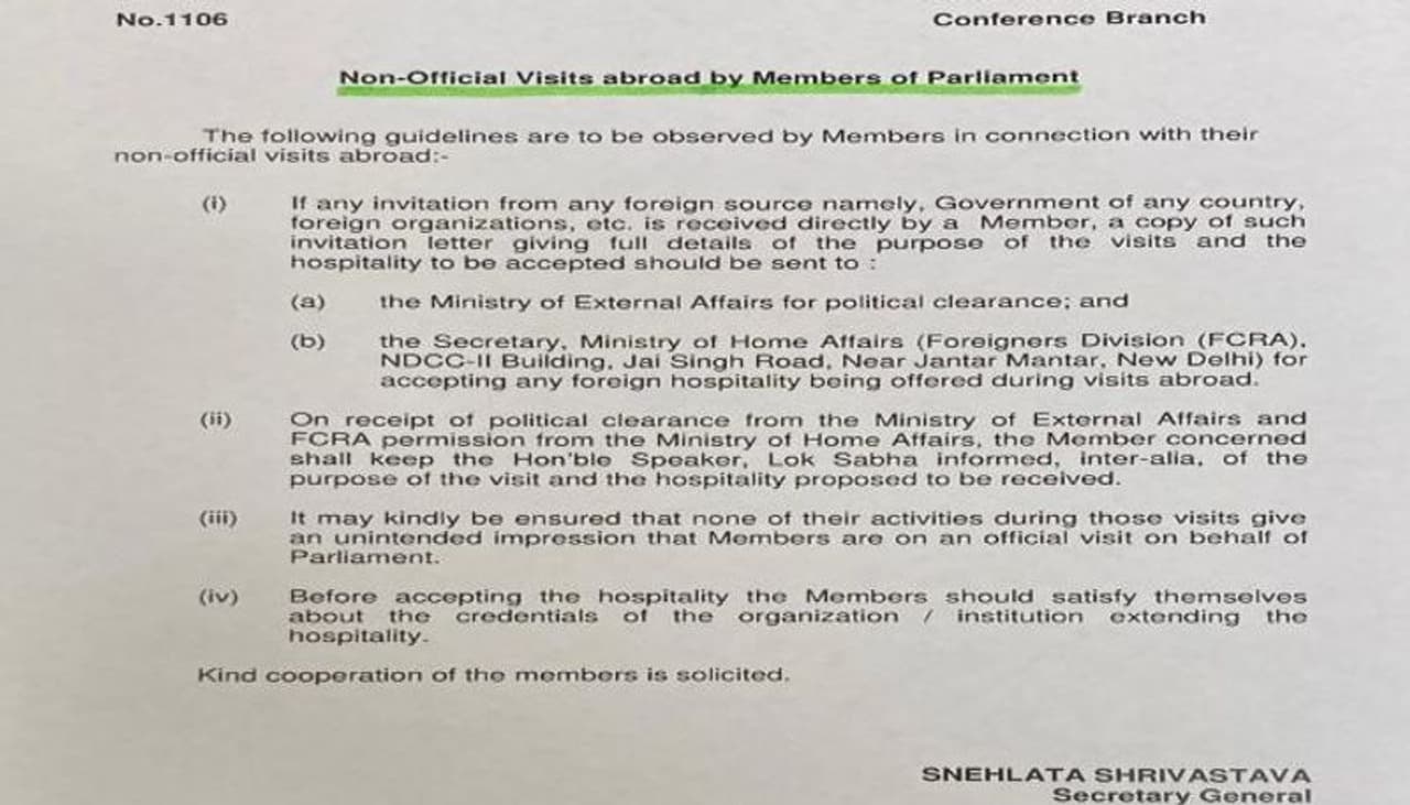 - सर्कुलर में यह भी कहा गया है कि सांसदों को यह सुनिश्चित करना होगा कि उनकी गतिविधियों से यह आभास न हो कि वे आधिकारिक दौरे पर हैं और उन्हें किसी भी रूप में आतिथ्य या आतिथ्य प्रदान करने वाले संगठन / संस्थान के बारे में खुद को संतुष्ट करने का प्रयास नहीं करना चाहिए।