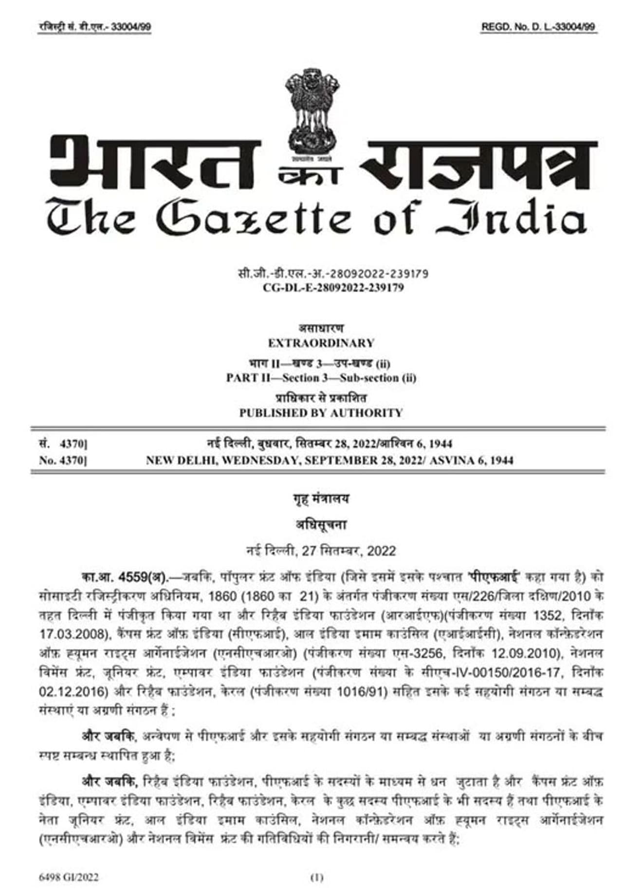 टेरर फंडिंग और देशविरोधी गतिविधियों में लिप्त चरमपंथी मुस्लिम संगठन पापुलर फ्रंट ऑफ इंडिया(PFI) पर सरकार ने बैन लगा दिया है। गृहमंत्रालय ने इस संबंध में आदेश जारी कर दिए हैं। NIA और ED सहित तमाम जांच एजेंसियां पिछले कई दिनों से इसके खिलाफ एक्शन में जुटी थीं।