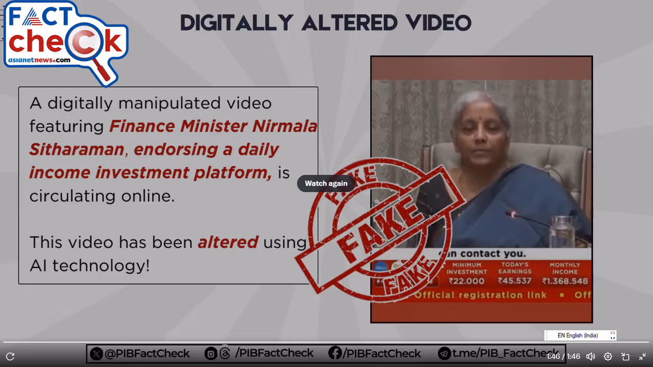 पीआईबी फैक्ट चेक में ये वीडियो पूरी तरह फर्जी निकला है। इसे AI की मदद से बनाया गया है। वित्त मंत्री या भारत सरकार द्वारा ऐसी कोई योजना न तो शुरू की गई है और न ही उसे सपोर्ट किया जा रहा है। इस तरह के किसी भी संदिग्ध निवेश दावे का शिकार न बनें। सतर्क रहें। भरोसा करने से पहले पुष्टि करें।