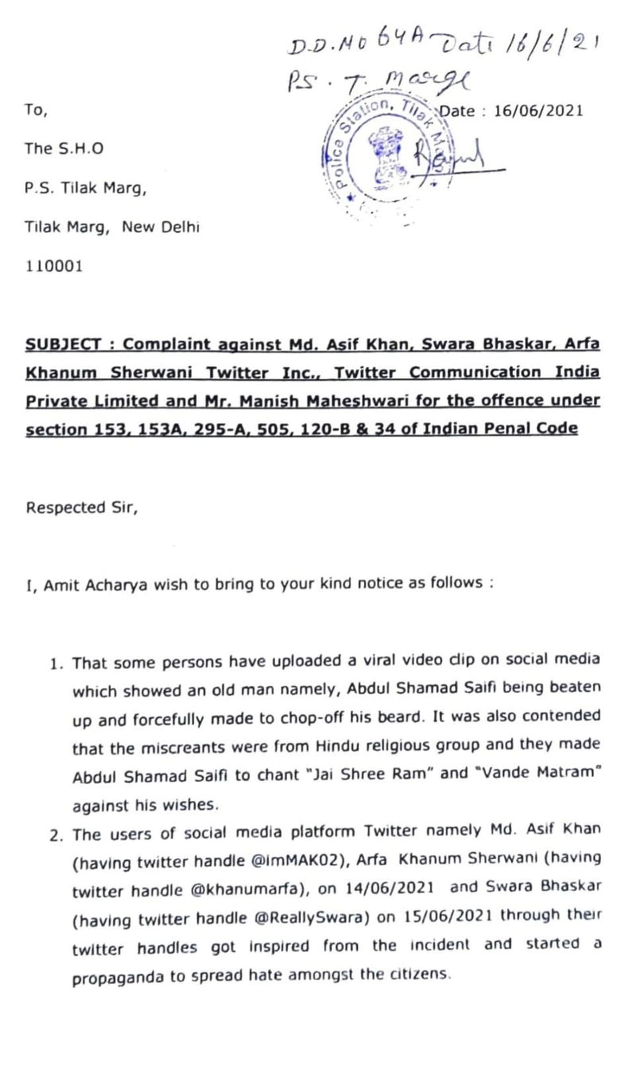 दिल्ली के तिलक मार्ग थाने में एडवोकेट अमित आचार्य ने स्वरा भास्कर और twitter इंडिया के हेड मनीष माहेश्वरी के खिलाफ शिकायत दी है। शिकायत में जर्नलिस्ट आरफा खानम शेरवानी और एक्टर आसिफ खान का नाम भी शामिल है। आरोप है कि गाजियाबाद मामले में इन सभी ने भड़काऊ ट्वीट किए।