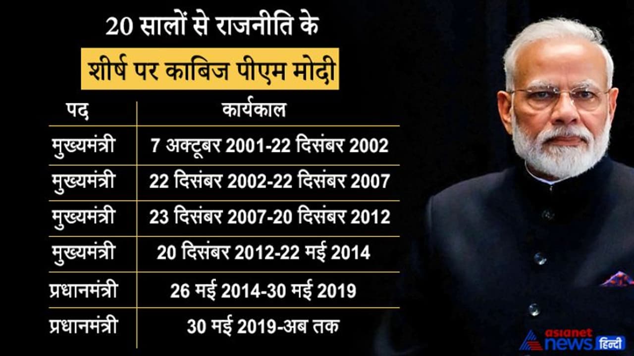 प्रधानमंत्री नरेंद्र मोदी (PM Narendra Modi) बुधवार 7 अक्टूबर को चुनी हुई सरकार के मुखिया के रूप में 20 वीं साल में प्रवेश कर लिया है। वे 2001 से 13 साल तक गुजरात के मुख्यमंत्री रहे। 2014 से अब तक प्रधानमंत्री हैं। भारतीय राजनीति के इतिहास में पीएम ने राज्य और केंद्र सरकारों के प्रमुख के तौर पर अपनी अहम भूमिका निभाई है।