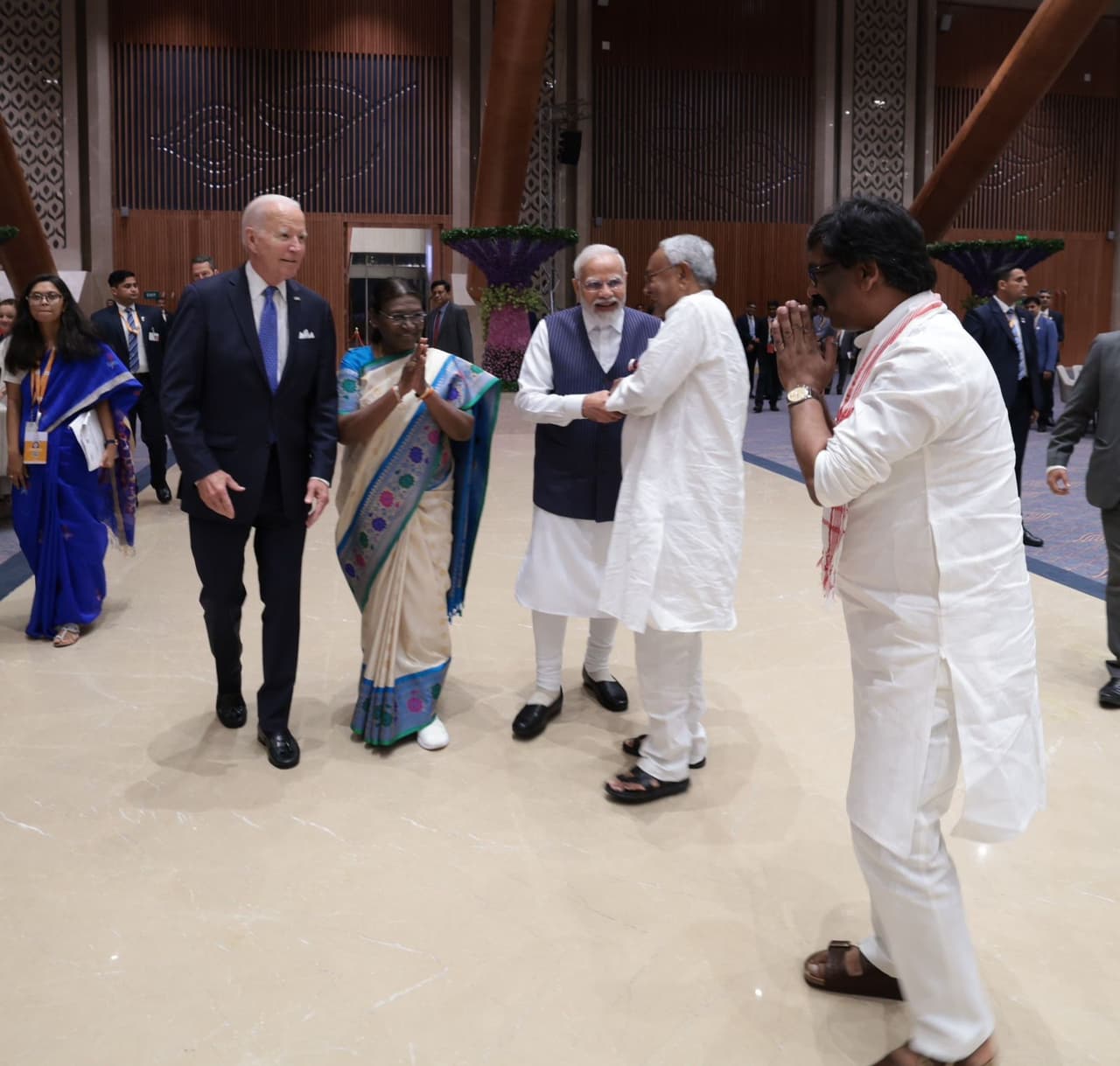 जी20 के गाला डिनर के दौरा प्रधानमंत्री नरेंद्र मोदी ने बिहार के सीएम नीतीश कुमार और झारखंड के मुख्यमंत्री हेमंत सोरेन की मुलाकात अमेरिकी राष्ट्रपति जो बाइडेन से करााई। इस दौरान राष्ट्रपति द्रौपदी मुर्मू भी मौजूद रहीं।
