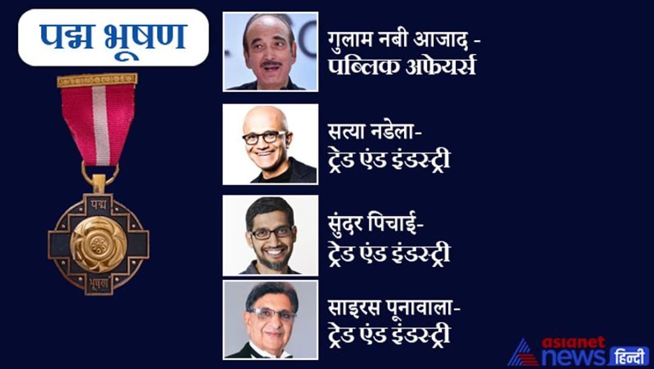 कांग्रेस नेता गुलाम नबी आजाद को पद्म भूषण से सम्मानित किया जाएगा। केंद्र सरकार ने जो सूची जारी की है, उसमें विभिन्न क्षेत्र में उल्लेखनीय कार्य के लिए 128 लोगों को सम्मानित करने का ऐलान किया है। इनमें 4 लोगों को पद्म विभूषण, 17 लोगों को पद्म भूषण और 107 लोगों को पद्म श्री से नवाजा जाएगा।