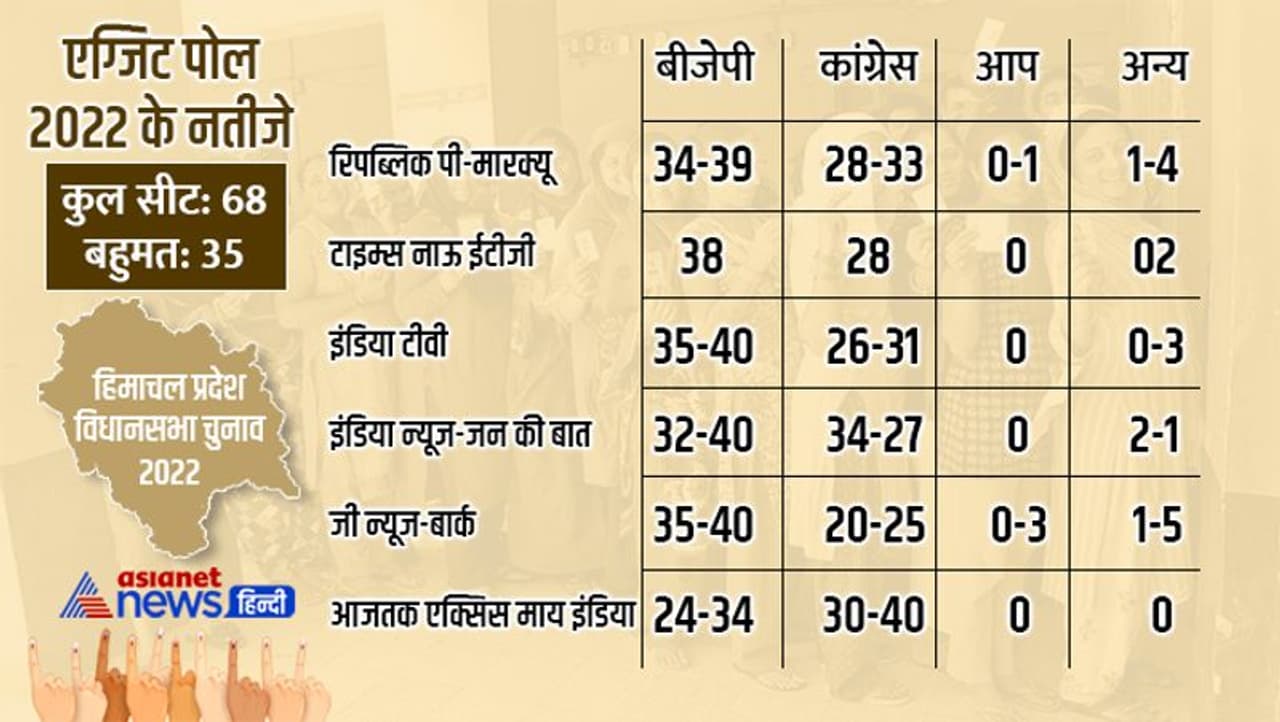 हिमाचल प्रदेश के एग्जिट पोल्स की बात करें तो यहां बीजेपी एकतरफा जीतती नजर नहीं आ रही है। रिपब्लिक पी मारक्यू के सर्वे में बीजेपी को 34-39 सीटें, कांग्रेस को 28-33 सीटें मिलती दिखी रही हैं। वहीं टाइम्स नाऊ-ईटीजी ने बीजेपी को 38 तो कांग्रेस को 28 सीटें दी हैं। इंडिया टीवी ने बीजेपी को 35-40 तो कांग्रेस को 26-31 सीटें जीतने का अनुमान जताया है। वहीं इंडिया न्यूज-जन की बात के सर्वे में बीजेपी को 32-40 और कांग्रेस को 27-34 सीटें मिलने का अनुमान है। जी न्यूज-बार्क ने बीजेपी को 35-40 और कांग्रेस को 20-25 सीटें दी हैं। वहीं, आज तक एक्सिस माय इंडिया ने बीजेपी को 24-34 और कांग्रेस को 30-40 सीटें मिलने का अनुमान जताया है। हिमाचल में आम आदमी पार्टी कहीं भी टक्कर में नहीं दिख रही है।