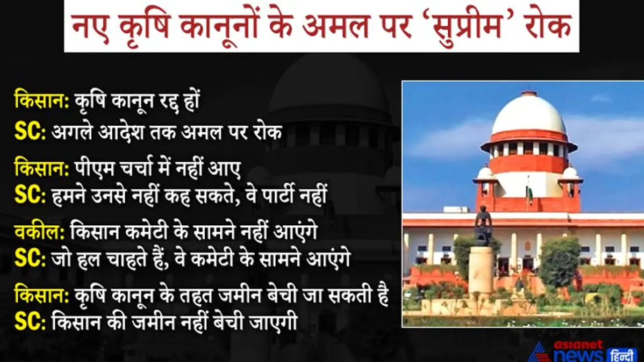 एसए बोबडे और जस्टिस एएस बोपन्ना और वी रामासुब्रमण्यन की बेंच ने तीन कृषि कानून, मूल्य आश्वासन और कृषि सेवा अधिनियम 2020 के किसानों (सशक्तीकरण और संरक्षण) समझौता, किसान व्यापार और वाणिज्य (संवर्धन और सुविधा) अधिनियम और उत्पादन आवश्यक वस्तु अधिनियम में संशोधन पर अगले आदेश तक रोक लगाई।