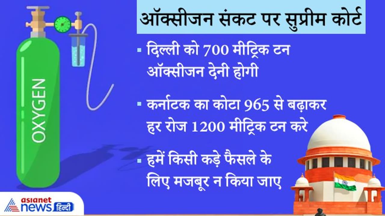 कोरोना संक्रमण की दूसरी लहर से देश में स्वास्थ्य सेवाएं चरमरा गई हैं। खासकर ऑक्सीजन की कमी एक बड़ी समस्या बनी हुई है। इस समस्या को लेकर सुप्रीम कोर्ट लगातार सुनवाई कर रही है। शुक्रवार को इसी विषय पर सुप्रीम कोर्ट ने केंद्र सरकार को दो टूक कहा कि उसे दिल्ली को जितना कोटा आवंटित किया है, वो उसे मिलना चाहिए। वहीं कर्नाटक का कोटा भी बढ़ाना पड़ेगा। सुप्रीम कोर्ट ने सख्त लहजे में कहा कि उसे कड़े फैसले के लिए मजबूर न किया जाए।