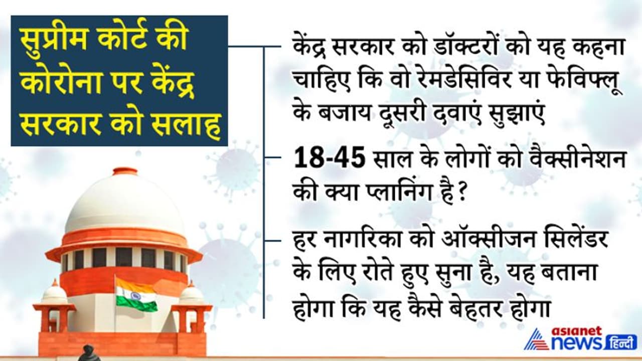 सुप्री कोर्ट ने केंद्र को सलाह दी कि वो डॉक्टरों से कहे कि रेमडेसिविर या फेविफ्लू की बजाय कोई दूसरी उपयुक्त दवाओं के बारे में सोचें। मरीजों को दूसरी दवाएं बताएं। सुप्रीम कोर्ट ने मीडिया रिपोर्ट का हवाला देकर कहा कि आरटीपीसीआर से कोविड के नए रूप की पड़ताल नहीं हो पा रही है, इसमें रिसर्च की जरूरत है।