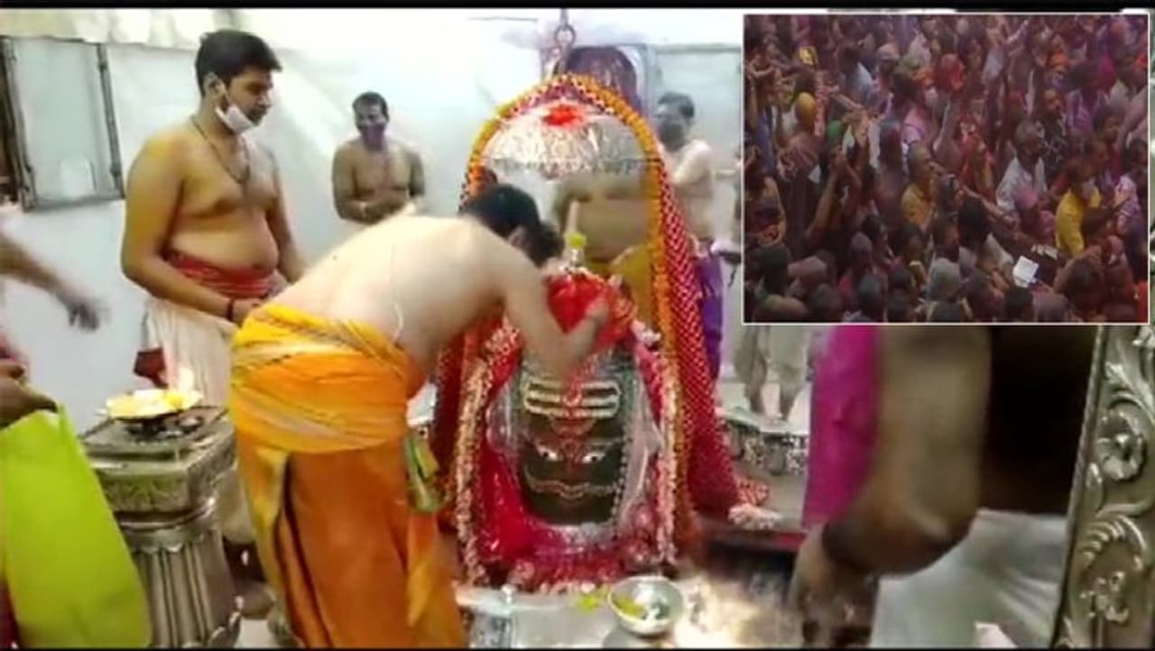 (यह तस्वीर मध्य प्रदेश के उज्जैन के महाकालेश्वर मंदिर की है। यहां भगवान महाकाल को रंग लगाकर होली मनाई गई। इनसेट तस्वीर मथुरा के बांके बिहारी मंदिर की है। यहां परंपरागत तरीके से लोगों ने होली मनाई। यहां काफी भीड़ देखी गई।)