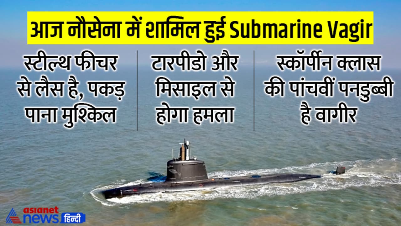 नई दिल्ली। हिंद महासागर में पिछले कुछ सालों में चीनी नौसेना की उपस्थिति बढ़ी है। इसे देखते हुए भारत नौसेना को अत्याधुनिक हथियार प्रणालियों से लैस कर रहा है। इसी क्रम में सोमवार को पनडुब्बी वागीर नौसेना में शामिल हुआ। 5 प्वाइंट में जानें ताकत...