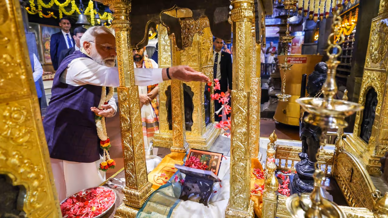 प्रधानमंत्री नरेंद्र मोदी शुक्रवार को उडुपी में श्री कृष्ण मठ के दौरे के दौरान भगवान कृष्ण की पूजा करते हुए।