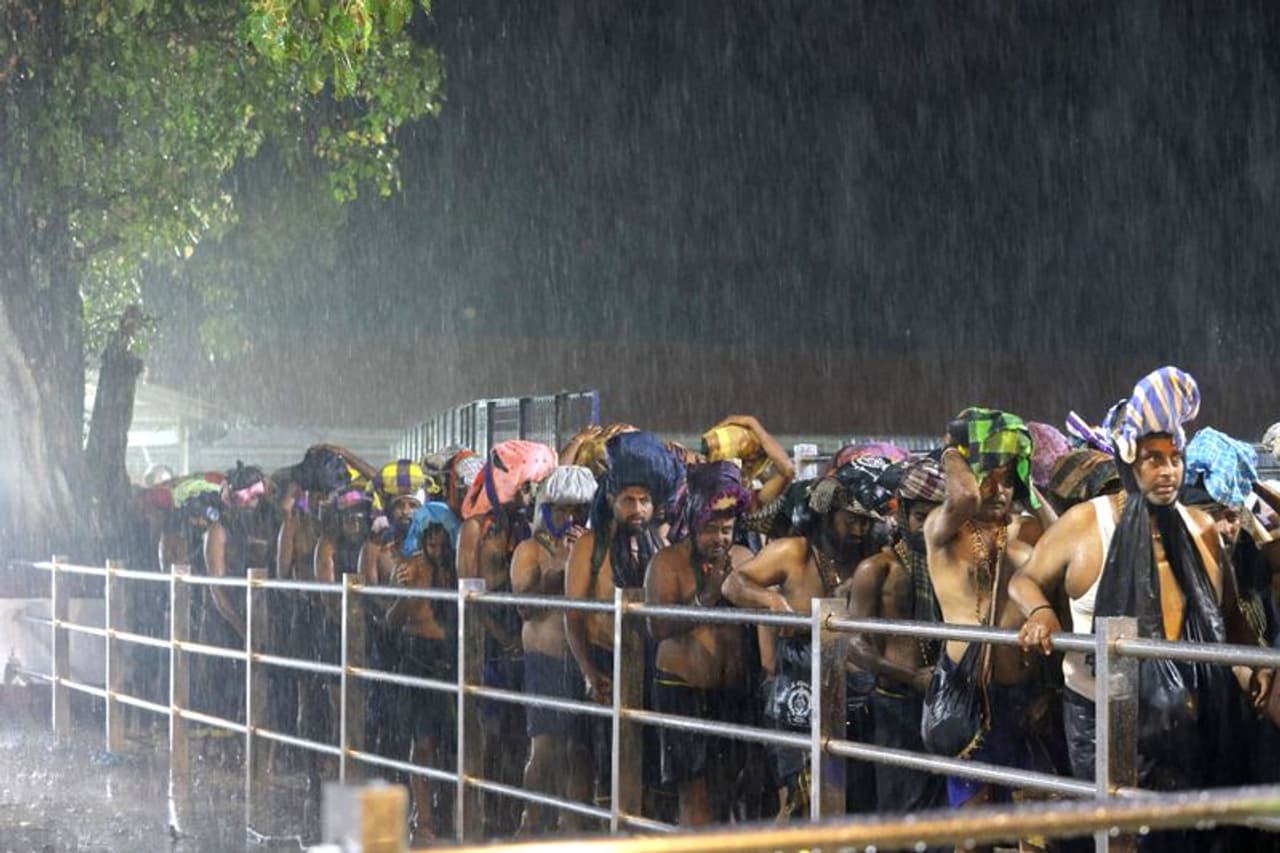(पठानमथिट्टा-Pathanamthitta: 16 नवंबर को भारी बारिश के बीच सबरीमाला मंदिर में इंतजार करते भगवान अयप्पा के भक्त )