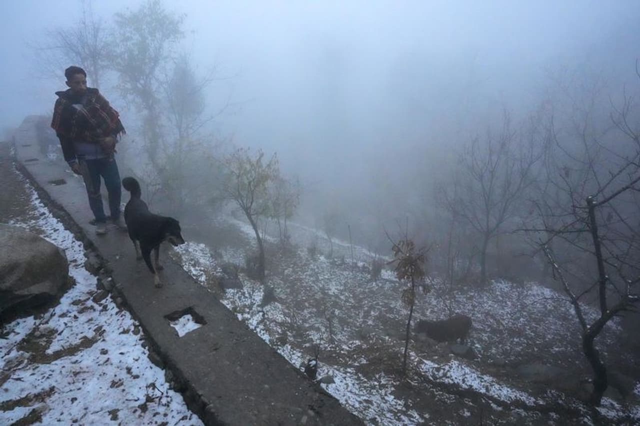 (श्रीनगर: श्रीनगर के बाहरी इलाके में कोहरे के मौसम और हल्की बर्फबारी के बीच कुत्ते के साथ चलता एक आदमी)