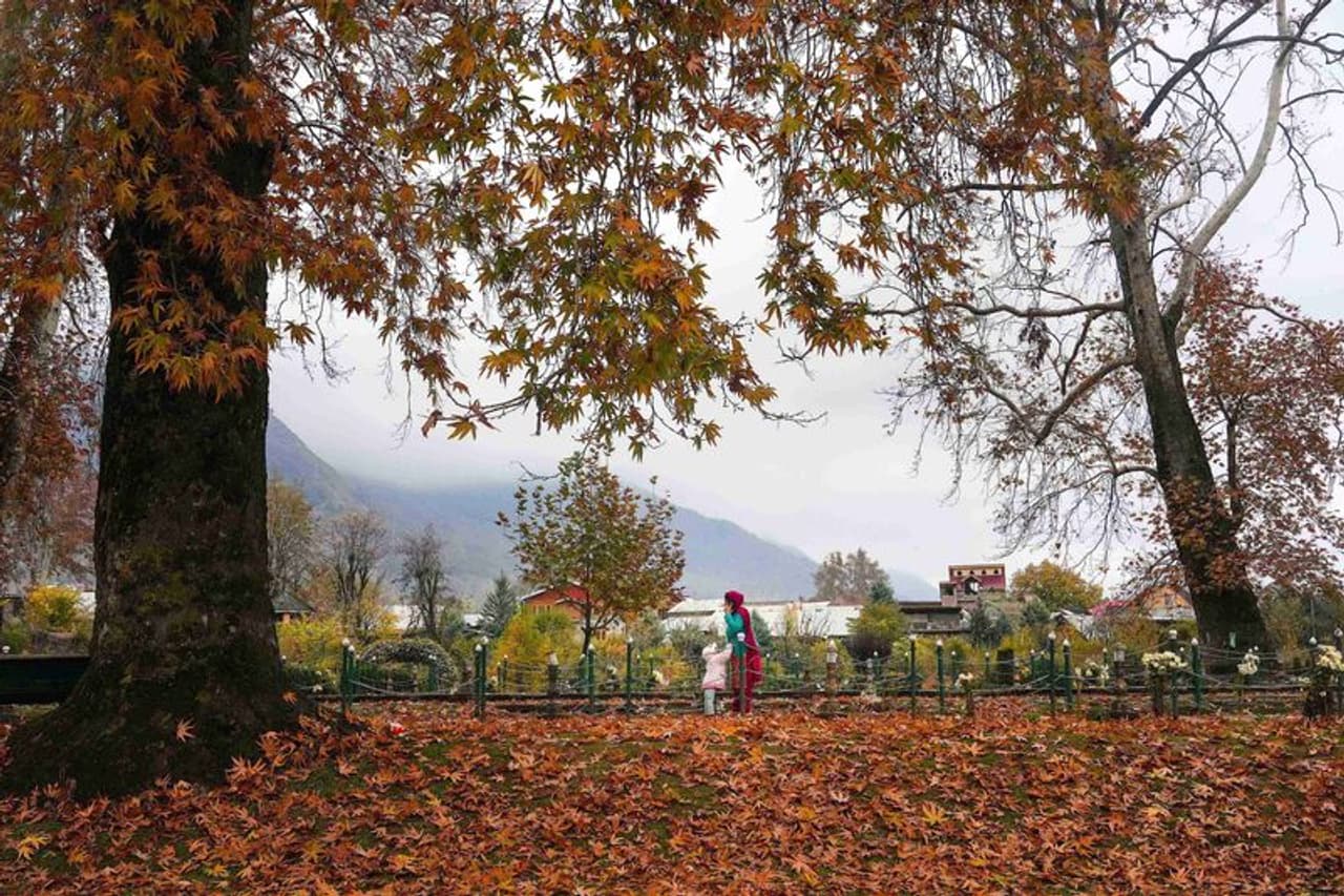 (श्रीनगर: बारिश के बाद चिनार के पेड़ों से शरद ऋतु की झाइयां बगीचे के एक हिस्से को कवर करती हुईं)
