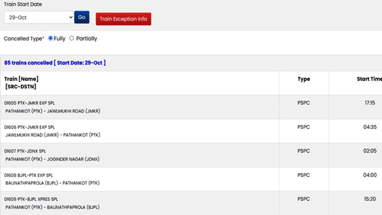 कैंसिल ट्रेनों की पूरी लिस्ट देखने के लिए यहां क्लिक करें..