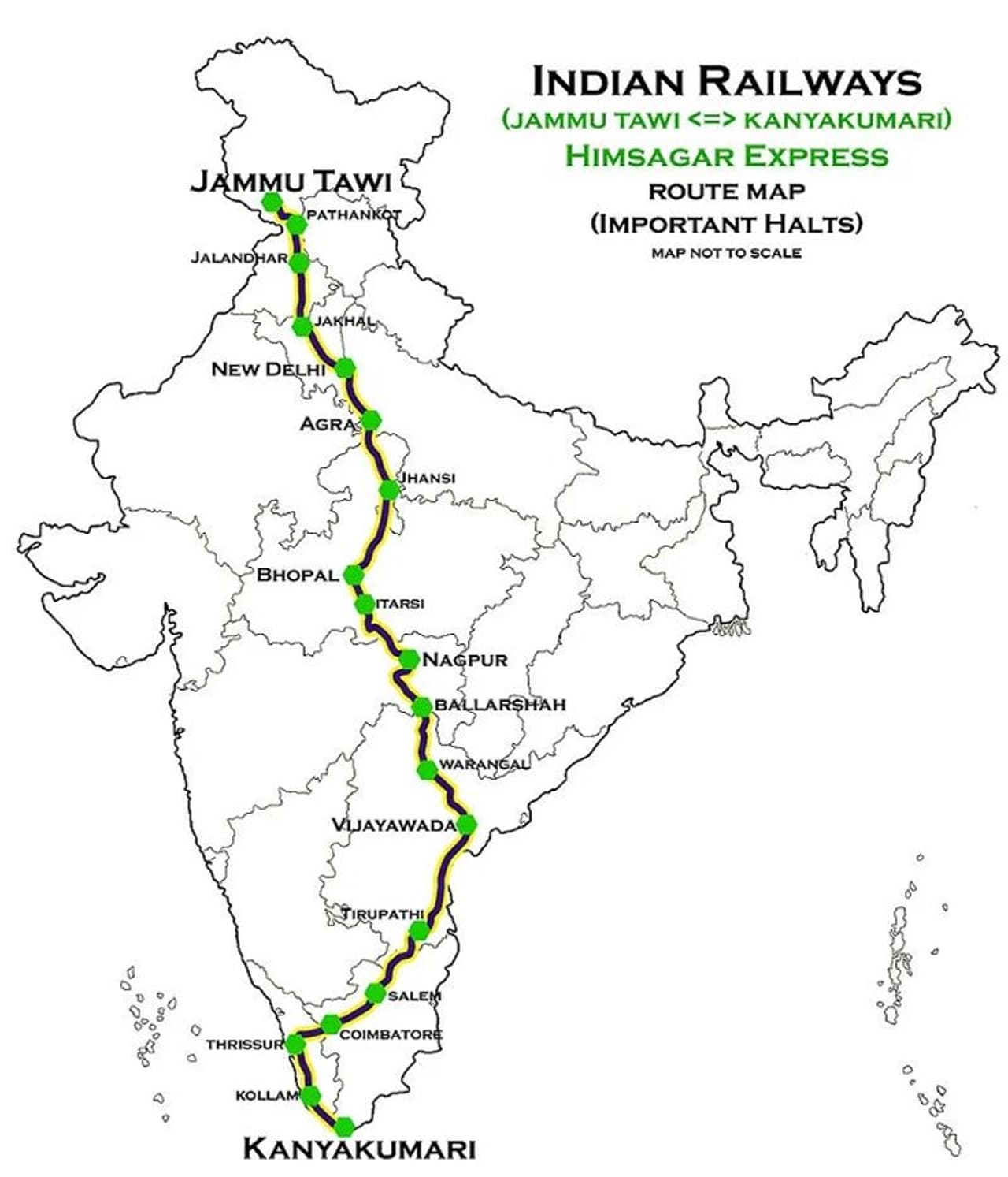 जम्मू तवी-कन्याकुमारी: जम्मू तवी से कन्याकुमारी रेलवे रूट की लंबाई 3787 किलोमीटर है। इस रूट पर हिमसागर एक्सप्रेस चलती है। यह कन्याकुमारी (तमिलनाडु) से श्री माता वैष्णो देवी कटरा जम्मू-कश्मीर के बीच चलती है। यह अपना सफर 72 घंटे में पूरा करती है।