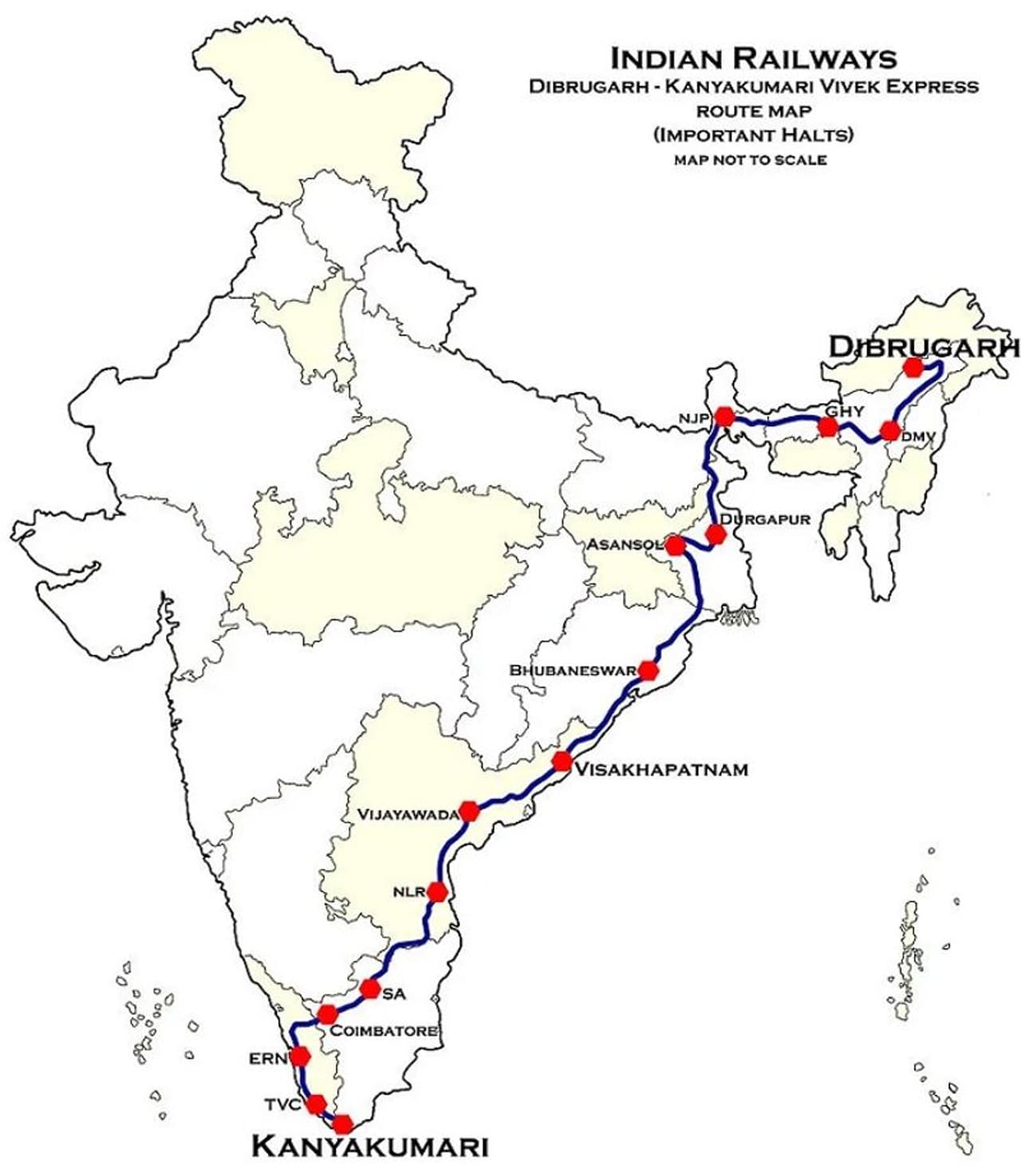 डिब्रूगढ़ से कन्याकुमारी भारत का सबसे लंबा रेलवे रूट है। इसकी लंबाई 4273 किलोमीटर है। इस रूट पर चलने वाली विवेक एक्सप्रेस को अपना सफर पूरा करने में 80 घंटे से अधिक समय लगता है।