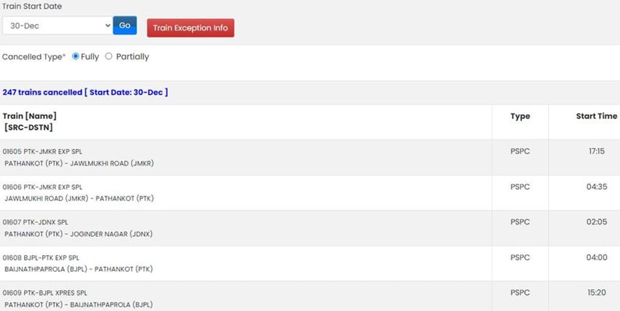 5- इसे सिलेक्ट करते ही आपके सामने उस दिन की पूरी तरह कैंसिल और आंशिक रूप से कैंसिल ट्रेनों की लिस्ट सामने आ जाएगी।