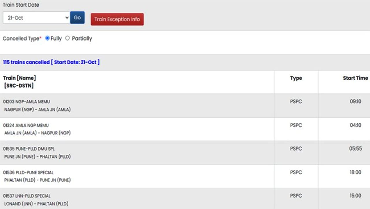 5- इसे सिलेक्ट करते ही आपके सामने उस दिन की पूरी तरह कैंसिल और आंशिक रूप से कैंसिल ट्रेनों की लिस्ट सामने आ जाएगी।