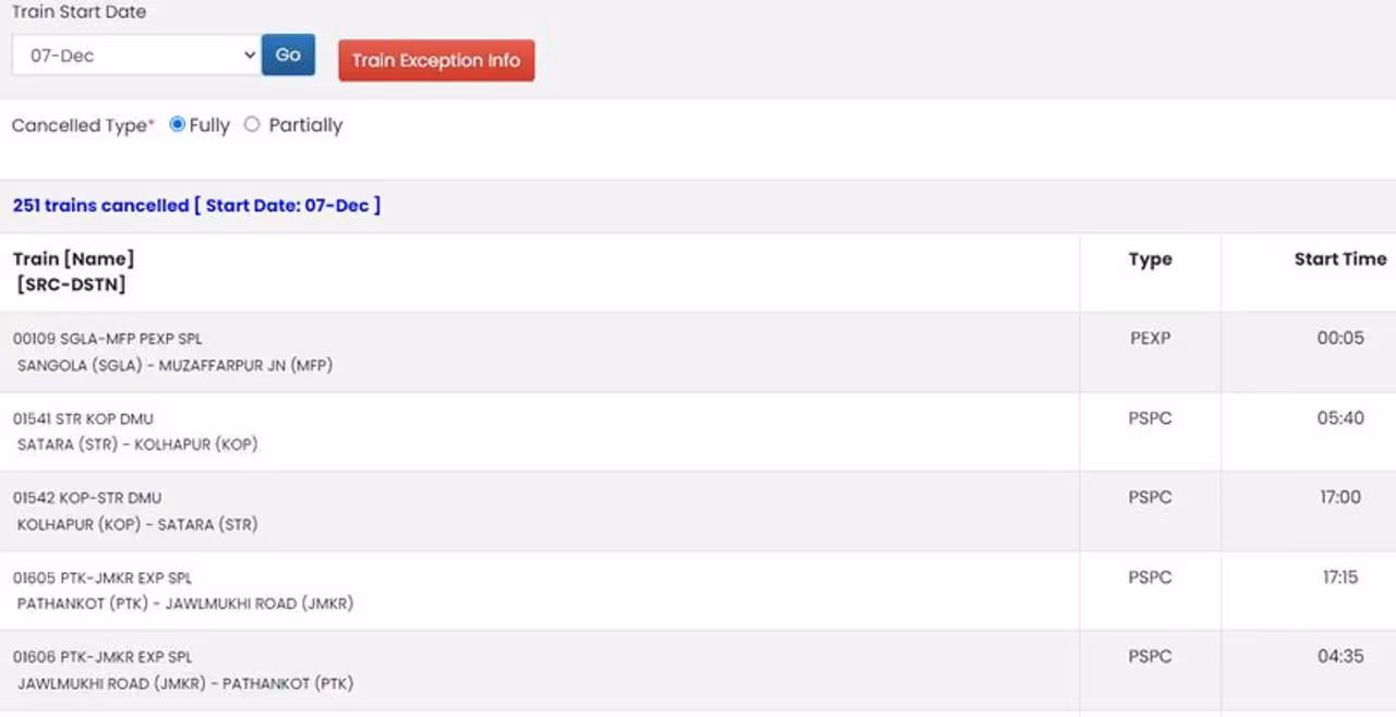 5- इसे सिलेक्ट करते ही आपके सामने उस दिन की पूरी तरह कैंसिल और आंशिक रूप से कैंसिल ट्रेनों की लिस्ट सामने आ जाएगी।