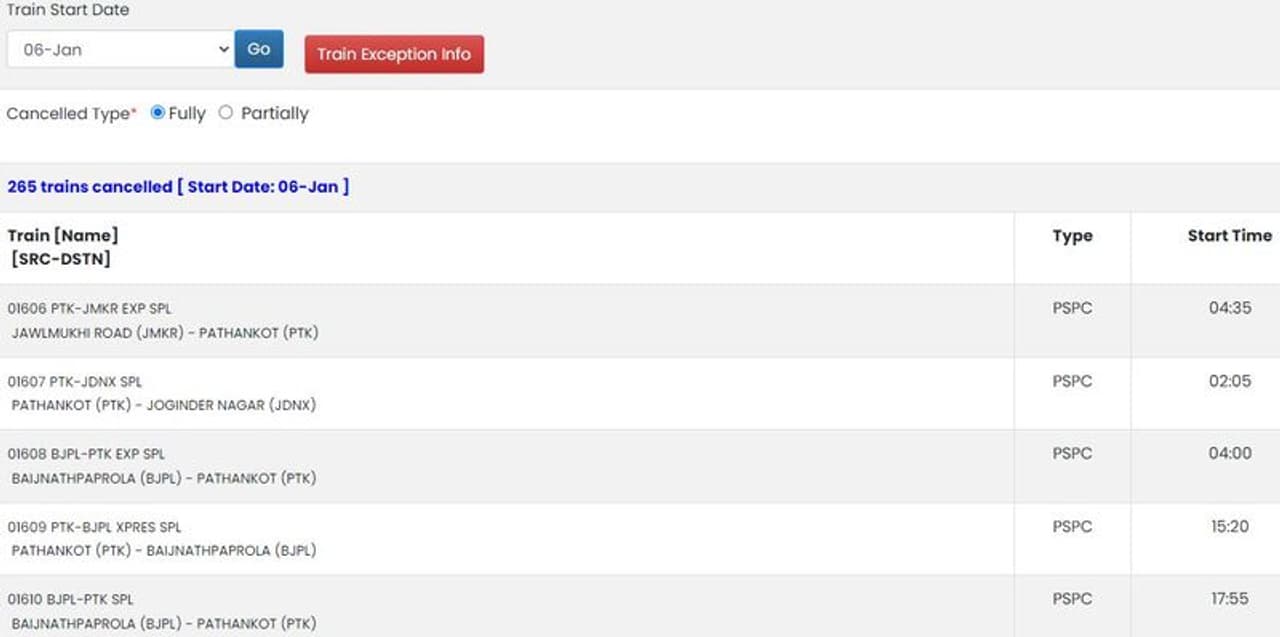 5- इसे सिलेक्ट करते ही आपके सामने उस दिन की पूरी तरह कैंसिल और आंशिक रूप से कैंसिल ट्रेनों की लिस्ट सामने आ जाएगी।