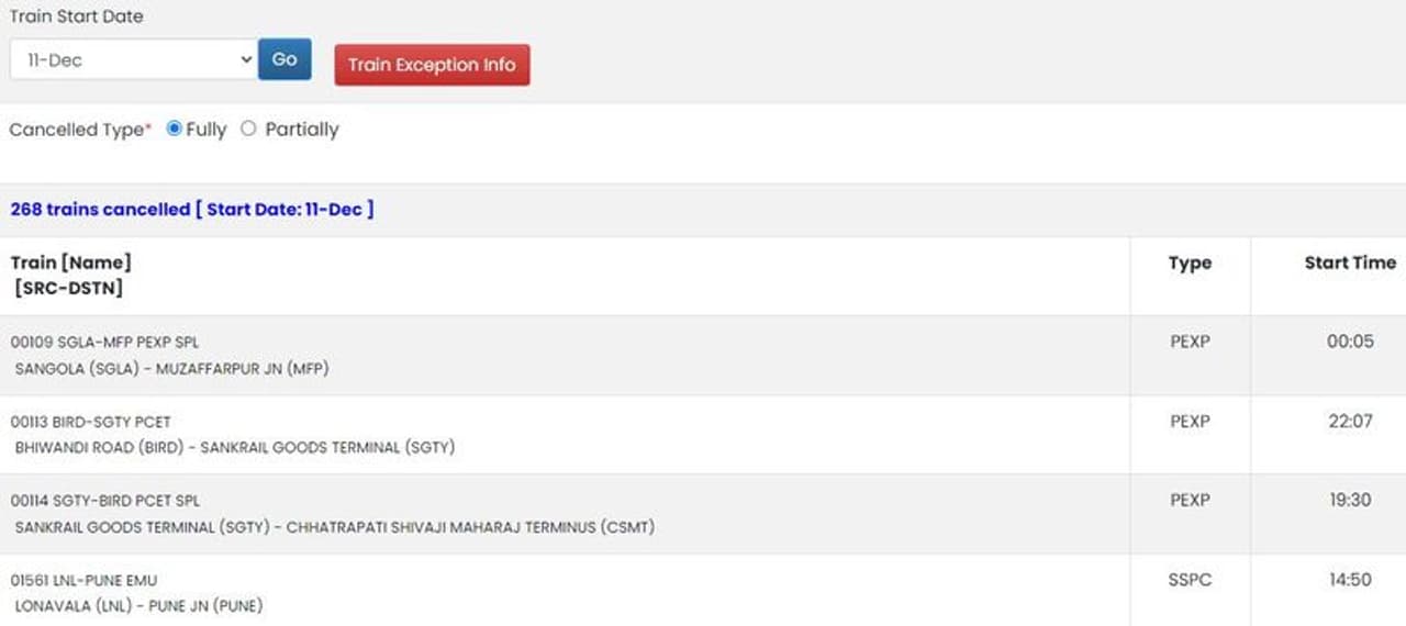 5- इसे सिलेक्ट करते ही आपके सामने उस दिन की पूरी तरह कैंसिल और आंशिक रूप से कैंसिल ट्रेनों की लिस्ट सामने आ जाएगी।