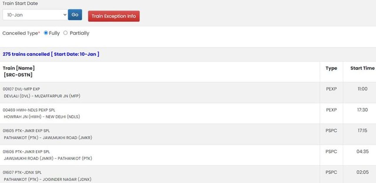 अगर आप 10 जनवरी यानी मंगलवार को रेल से यात्रा करने वाले हैं, तो सफर पर निकलने से पहले अपनी ट्रेन की स्थिति एक बार जरूर चेक कर लें। दरअसल, रेलवे ने 10 जनवरी, 2023 को 275 ट्रेनों को रद्द किया है। साथ ही 49 ट्रेनों के सोर्स स्टेशन में भी बदलाव किया गया है।