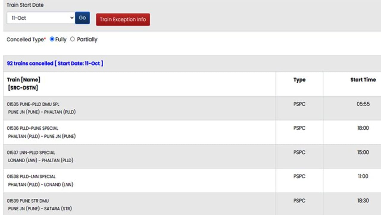 5- इसे सिलेक्ट करते ही आपके सामने उस दिन की पूरी तरह कैंसिल और आंशिक रूप से कैंसिल ट्रेनों की लिस्ट सामने आ जाएगी।
