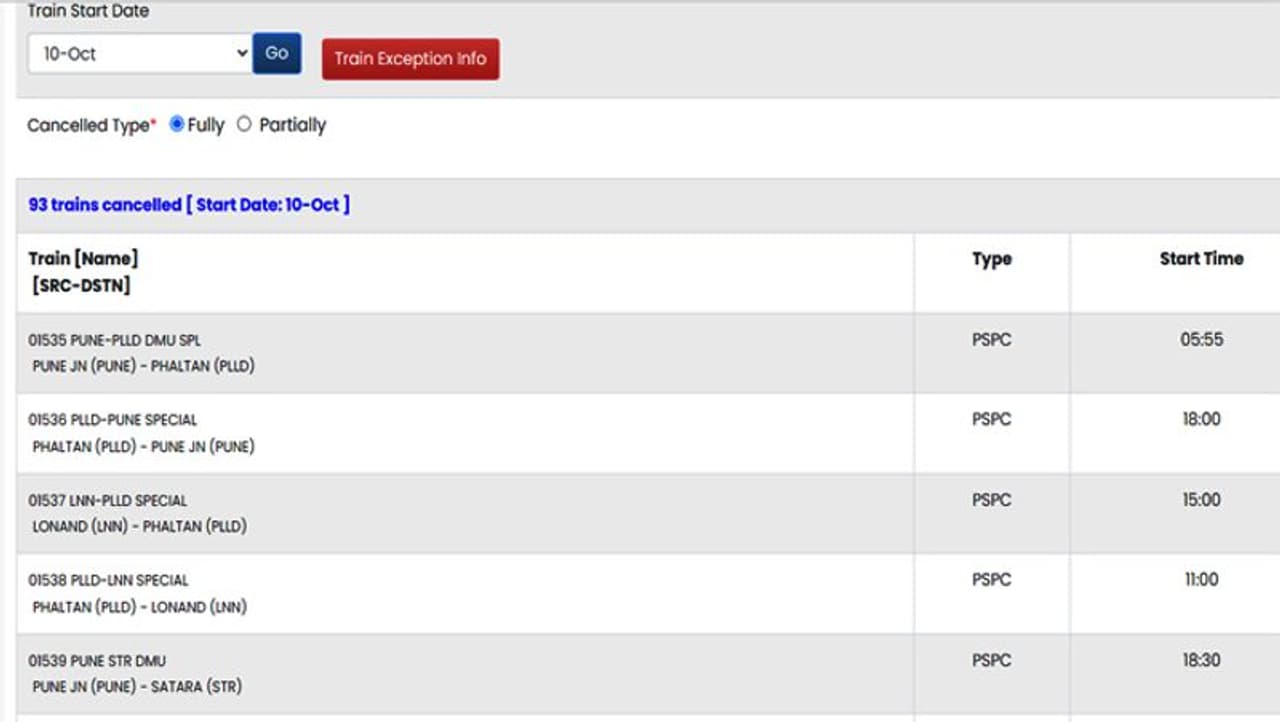 5- इसे सिलेक्ट करते ही आपके सामने उस दिन की पूरी तरह कैंसिल और आंशिक रूप से कैंसिल ट्रेनों की लिस्ट सामने आ जाएगी।