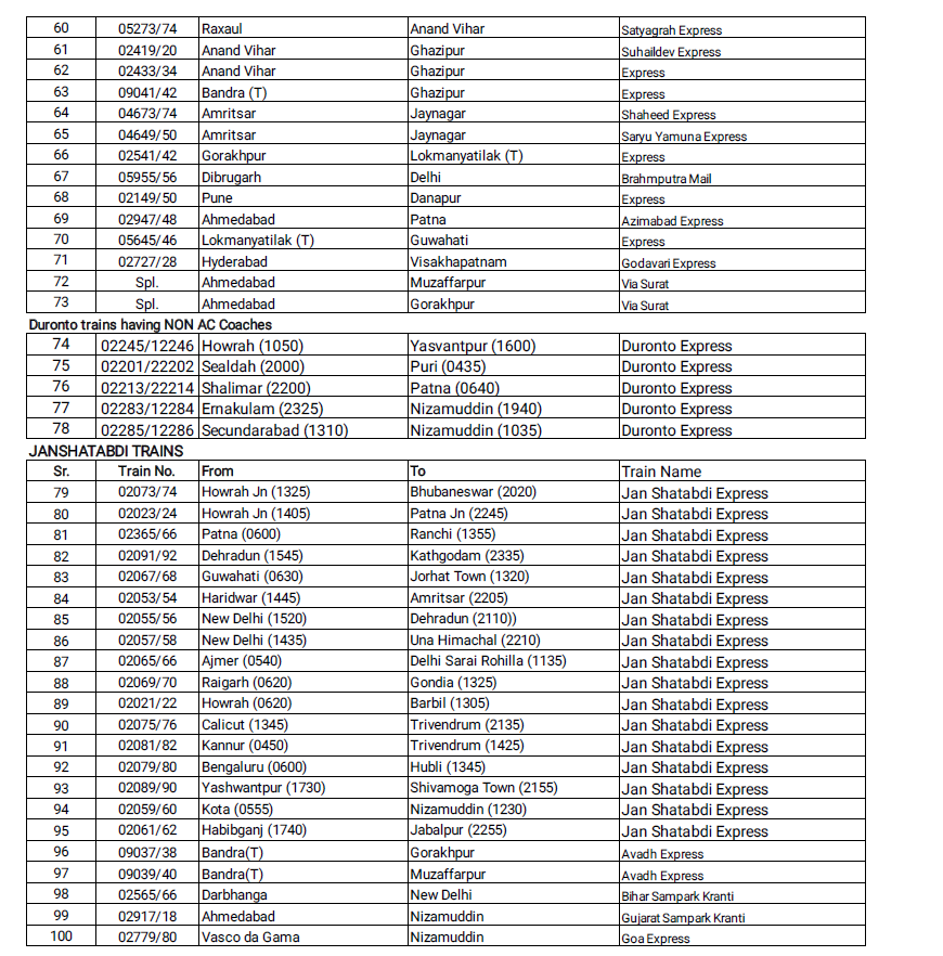 नई दिल्ली. देश में जारी कोरोना संकट और लॉकडाउन के बीच रेलवे ने यात्रियों को राहत देने की तैयारी की है। रेलवे 1 जून से 200 ट्रेनों की शुरुआत करेगा। जिसके लिए टिकटों की बुकिंग आज यानी गुरुवार सुबह 10 बजे से शुरू हुई। कौन सी ट्रेने कहां से चलेंगी इसको लेकर रेलवे ने बुधवार की देर रात लिस्ट जारी कर दी है। इनमें दुरंतो, संपर्क क्रांति, जन शताब्दी और पूर्वा एक्सप्रेस जैसी गाड़ियां भी शामिल हैं। इन गाड़ियों में एसी और नॉन एसी कोच होंगे। जनरल कोच में बैठने के लिए भी रिजर्वेशन लेना होगा। यानी ट्रेन में कोई अनरिजर्व्ड कोच नहीं होगा।