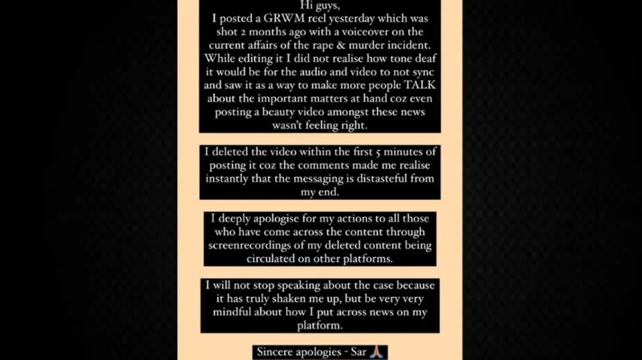जैसे-जैसे प्रतिक्रिया तेज होती गई, सारा ने मूल वीडियो को हटा दिया और सार्वजनिक रूप से माफी मांगी। अपने माफीनामे में, उसने दावा किया कि वीडियो दो महीने पहले फिल्माया गया था और बलात्कार और हत्या से संबंधित मौजूदा मुद्दों को संबोधित करने के प्रयास में बाद में वॉयसओवर जोड़ा गया था। उसने स्वीकार किया कि वीडियो का लहजा और सामग्री बेमेल थी।