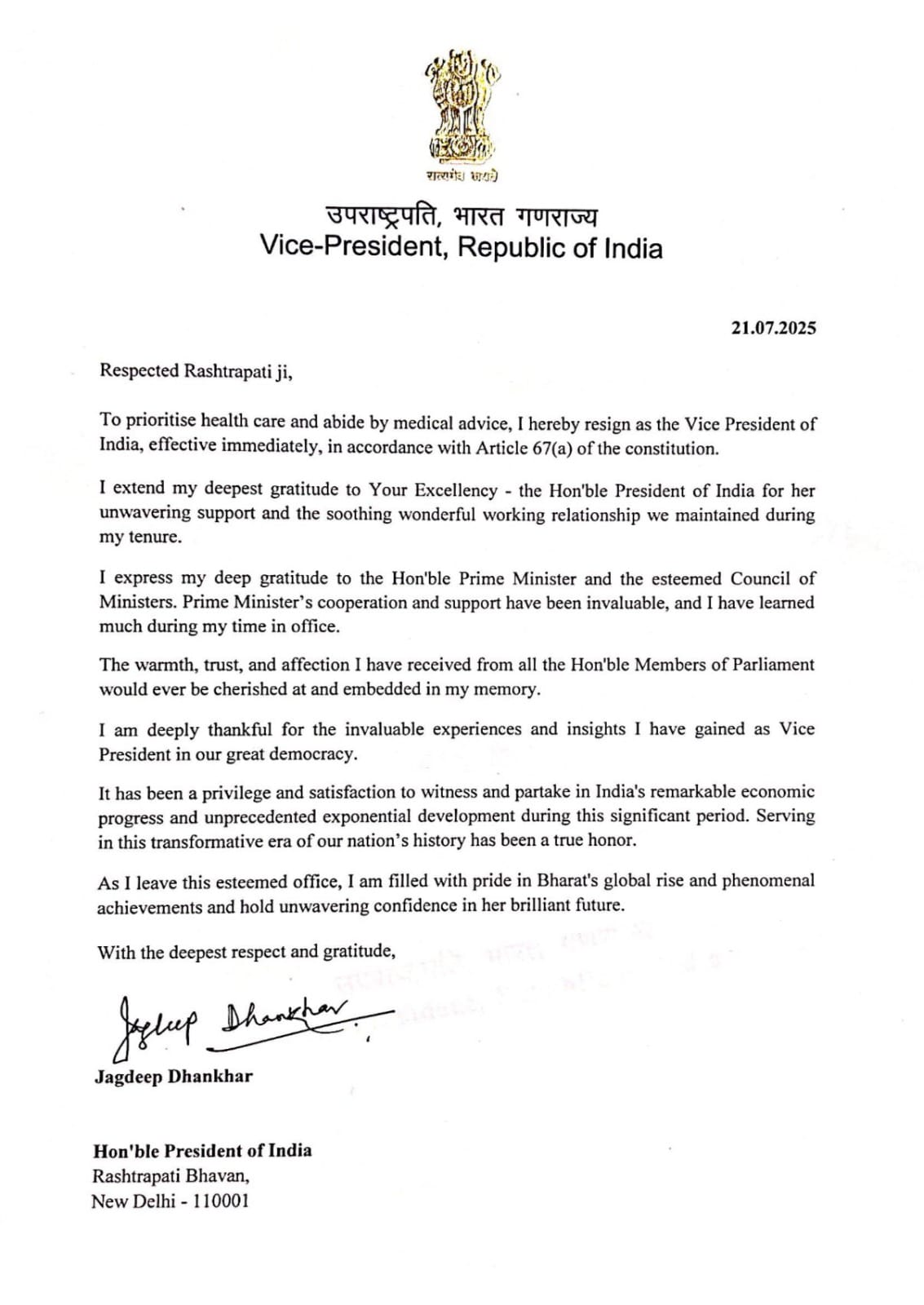 Vice president Jagadeep Dhankhar resigns: उपराष्ट्रपति जगदीप धनखड़ ने अपने पद से इस्तीफा दे दिया है। उपराष्ट्रपति धनखड़ ने इस्तीफा की वजह स्वास्थ्य संबंधी दिक्कतें बताई है। उन्होंने अपना इस्तीफा राष्ट्रपति द्रौपदी मुर्मू को सौंप दिया है। 74 वर्षीय धनखड़ ने राष्ट्रपति द्रौपदी मुर्मू (President Droupadi Murmu) को लिखे पत्र में कहा कि वह चिकित्सकीय सलाह के आधार पर यह निर्णय ले रहे हैं और अब अपने स्वास्थ्य को प्राथमिकता देना चाहते हैं। अपने इस्तीफे में उन्होंने कहा कि स्वास्थ्य देखभाल को प्राथमिकता देने और चिकित्सा सलाह का पालन करने के लिए, मैं संविधान के अनुच्छेद 67 (ए) के अनुसार, तत्काल प्रभाव से भारत के उपराष्ट्रपति पद से इस्तीफा देता हूं।