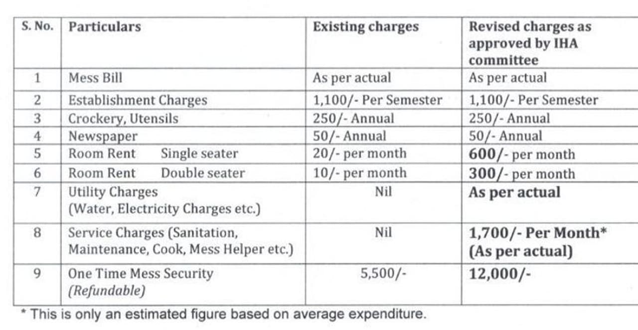 जेएनयू प्रशासन ने फीस में बढ़ोत्तरी करते हुए हॉस्टल में सिंगल रूम की फीस 10 रू से बढ़ाकर 300 रुपए कर दी गई है। इसके साथ ही डबल रूम की फीस 20 रुपए से बढ़ाकर 600 रुपए कर दी गई है। वहीं, मेस में वन टाइम रिफंडेबल मेस सिक्योरिटी राशि 5500 रुपए से 12 हजार रुपए कर दी गई है। जिसका जेएनयू के छात्र विरोध कर रहे है।