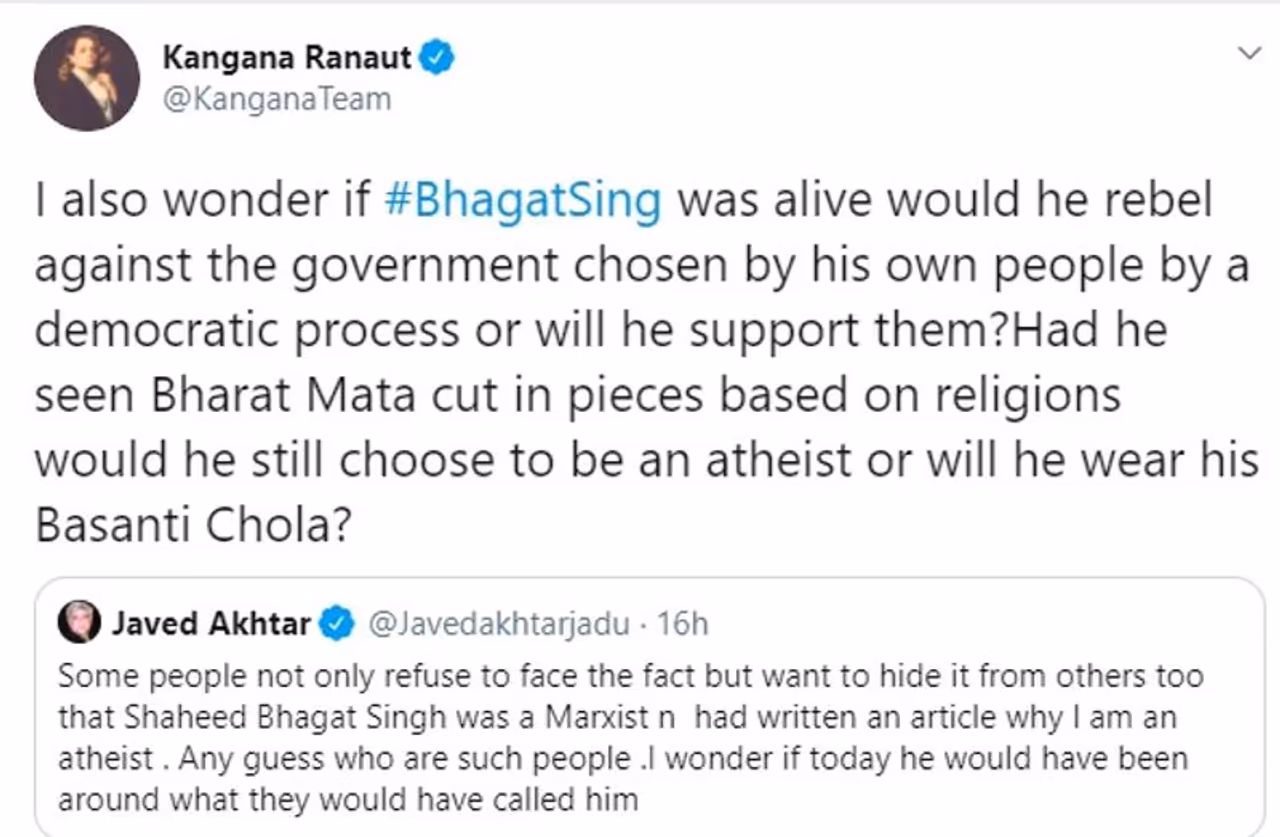 नई दिल्ली. शहीद भगत सिंह की 113वीं जयंती पर गीतकार और लेखक जावेद अख्तर के एक ट्वीट पर बहस छिड़ गई है। जावेद अख्तर ने भगत सिंह को लेकर एक ट्वीट करते हुए कहा कि वह एक मार्क्सवादी थे और उन्होंने मैं नास्तिक क्यों हूं नामक एक लेख भी लिखा था। जावेद अख्तर के इस ट्वीट के बाद सोशल मीडिया पर एक नई बहस शुरू हो गई। इस बीच कंगना रनौत जो कि सुशांत सिंह राजपूत मौत के बाद से चर्चा में हैं, वो भी कूंद पड़ीं। कंगना रनौत ने जावेद अख्तर के ट्वीट पर प्रतिक्रिया जाहिर करते हुए निशाना साधा।