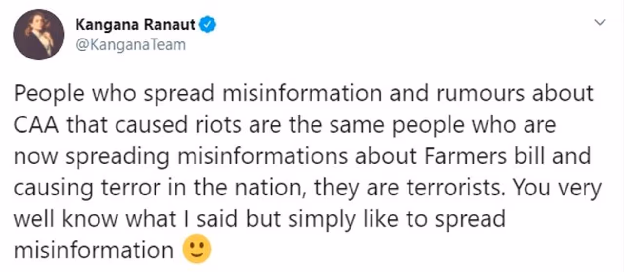 कंगना ने 21 सितंबर को अपने ट्विटर हैंडल @KanganaTeam से ट्वीट करते हुए लिखा था- जिन लोगों ने सीएए पर गलत जानकारी और अफवाहें फैलाईं, जिसकी वजह से हिंसा हुई वही लोग अब किसान विरोधी बिल पर पर गलत जानकारी फैला रहे हैं, जिससे राष्ट्र में डर है। वे आतंकी हैं। इसको लेकर वकील एल. रमेश नाइक ने कहा कि इस ट्वीट ने ठेस पहुंचाया है, जिसके चलते उन्हें कंगना रनौत के खिलाफ केस फाइल करने पर मजबूत होना पड़ा है।