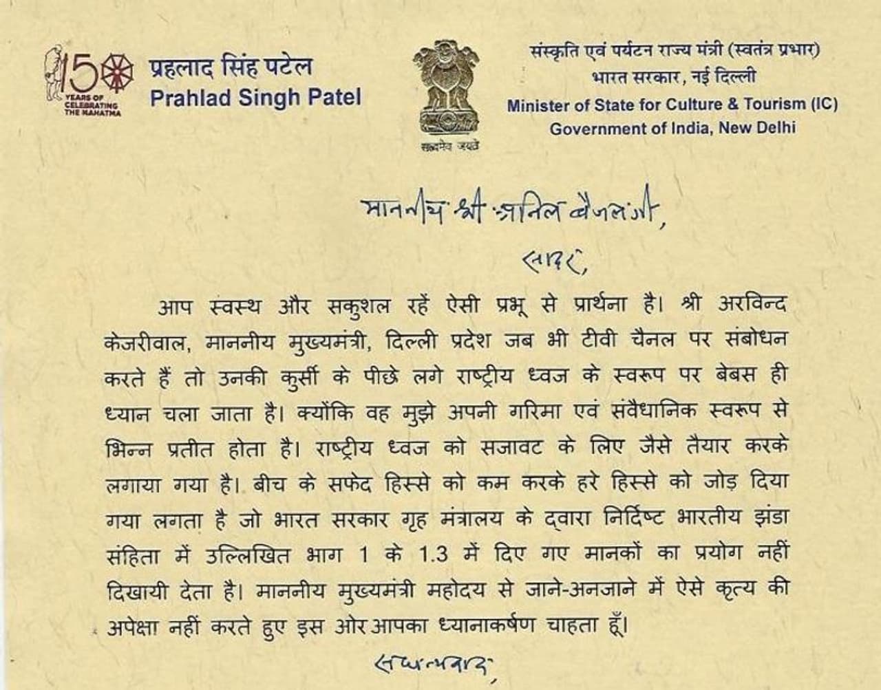 केंद्रीय मंत्री प्रहलाद पटेल ने कहा-मैं कुछ दिन से अरविंद केजरीवाल की प्रेस कांफ्रेंस देख रहा था, उनके पीछे लगे 2 ध्वज में सफेद रंग पर हरी पट्टियां बढ़ाई गई हैं। मैंने इसके लिए अरविंद केजरीवाल को पत्र लिखा है, मैंने उपराज्यपाल को भी पत्र की कॉपी पहुंचाई है।