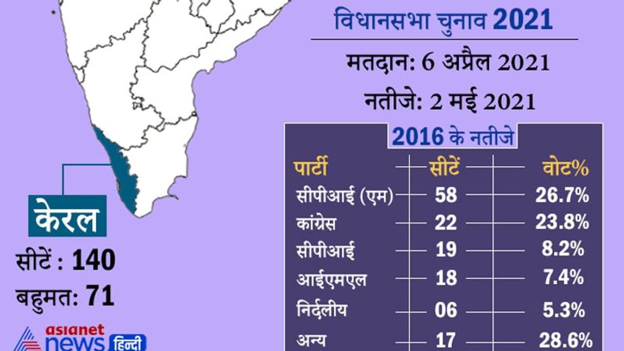 केरल विधानसभा चुनाव 2016 में एलडीएफ को 91 और कांग्रेस के नेतृत्व वाले यूनाइटेड डेमोक्रेटिक फ्रंट (यूडीएफ) को 47 सीटें मिली थीं। यहां बहुमत के लिए 71 सीटें चाहिए।