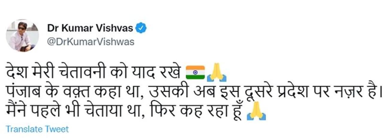 इस बीच प्रसिद्ध कवि और पूर्व आप नेता कुमार विश्वास (Kumar Vishwas) ने घटना को लेकर ट्वीट किया है। खालिस्तानी झंडे संबंधी खबर का हवाला देते हुए कुमार विश्वास ने ट्वीट किया, "देश मेरी चेतावनी को याद रखे। पंजाब (पंजाब विधानसभा चुनाव) के वक्त कहा था, उसकी अब इस दूसरे प्रदेश पर नजर है। मैंने पहले भी चेताया था, फिर कह रहा हूं।"