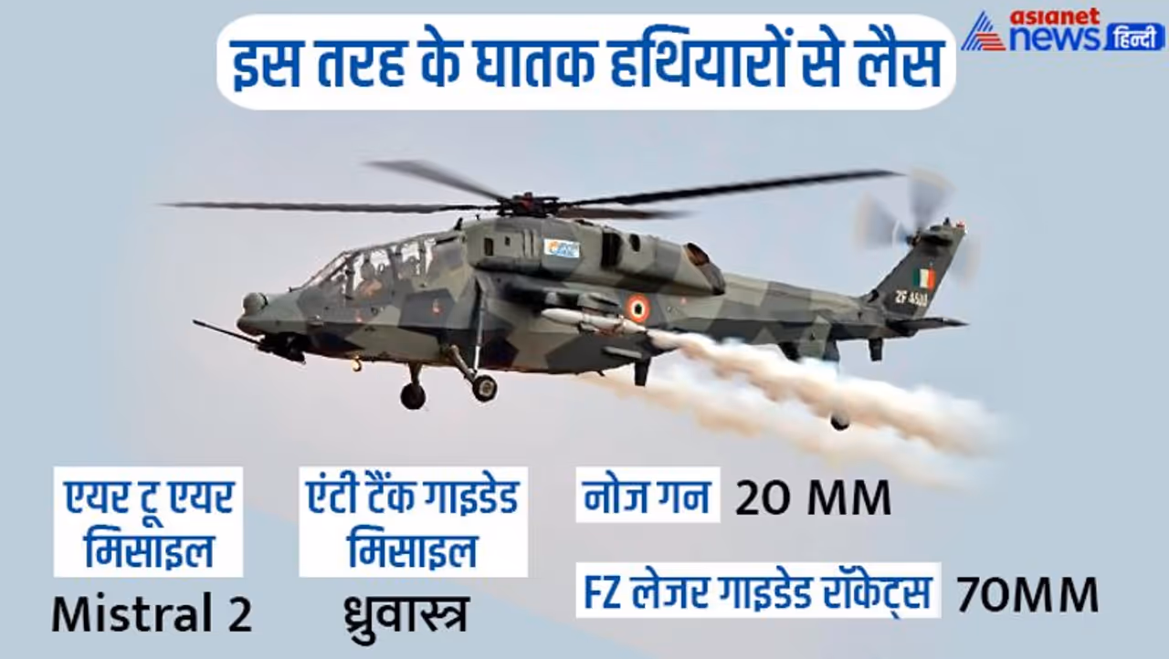 इसका कॉकपिट ग्लास से बना है। साथ ही बॉडी फ्रेम कंपोजिट है। यानी इस पर सामान्य असॉल्ट राइफलों की गोलियों का कोई असर नहीं होगा। इसमें कॉकपिट के ठीक नीचे 20 mm की तोप है। इसमें अलग-अलग तरह के हथियार लगाए जा सकते हैं। इसमें हवा से हवा में मार करने वाली Mistral 2 मिसाइलें तैनात की जा सकती हैं। इसके अलावा चार ध्रुवास्त्र एंटी-टैंक गाइडेड मिसाइलें भी लगाई जा सकती हैं।
