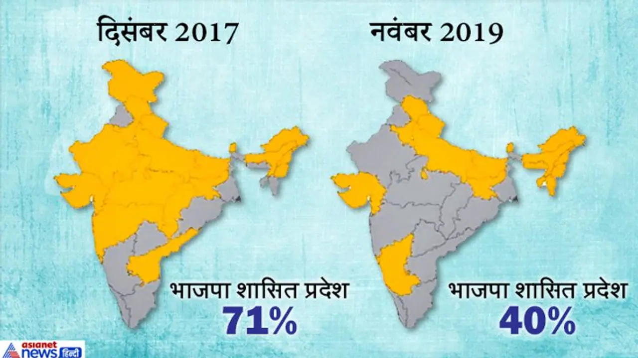 दिसंबर 2017 के बाद बीजेपी के सिमटने का दौर शुरू हुआ और नवंबर 2019 तक बीजेपी 71 फीसदी से घटकर 40 फीसदी में आ गई। अब बीजेपी की सत्ता सिमटकर देश के 40 फीसदी हिस्से में रह गई है। जिसके बाद एक बात तो साफ है कि साल 2017 के मुकाबले साल 2019 में प्रधानमंत्री नरेंद्र मोदी और अमित शाह का जादू कम हुआ है।