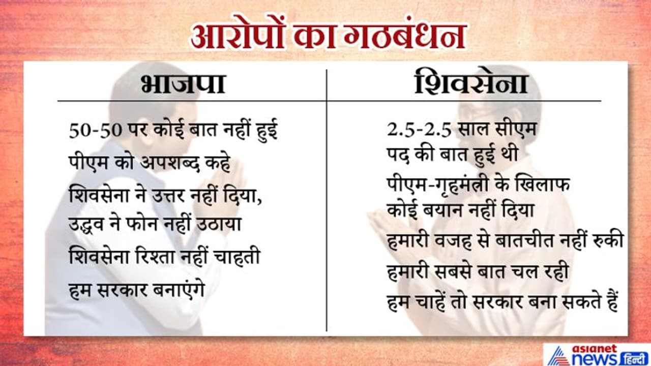 उधर, शिवसेना के संजय राउत ने एनसीपी प्रमुख शरद पवार से मुलकात की। इसके बाद उन्होंने भाजपा के आरोपों पर जवाब दिया। राउत ने कहा कि जब 50-50 फॉर्मूले और 2.5-2.5 साल के लिए मुख्यमंत्री पद के बंटवारे की बात हुई थी, तो उस वक्त गडकरी मौजूद नहीं थे। भाजपा के साथ 50-50 फॉर्मूला तय हुआ था।