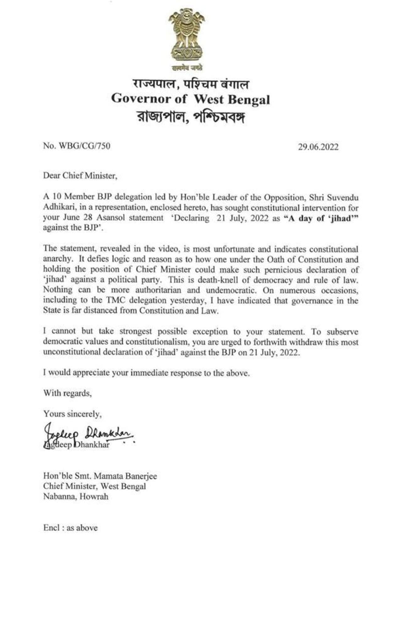 राज्यपाल धनखड़ ने बताया कि आसनसोल में मुख्यमंत्री ममता बनर्जी ने बीजेपी के खिलाफ 21 जुलाई को जेहाद का ऐलान किया है। यह किसी भी सूरत में असंवैधानिक है और सिविल सोसाइटी में मान्य नहीं है। उन्होंने कहा कि मैंने मुख्यमंत्री को पत्र लिखकर ऐसे बयान को वापस लेने को कहा है। ऐसे घातक बयान नहीं आने चाहिए।