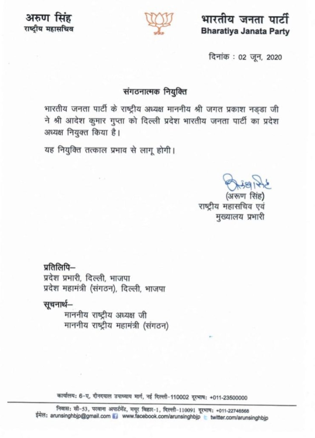 भाजपा अध्यक्ष जेपी नड्डा ने तीन राज्यो में नए भाजपा प्रदेश अध्यक्ष की नियुक्ति की है। आदेश कुमार गुप्ता को मनोज तिवारी की जगह दिल्ली भाजपा का अध्यक्ष बनाया गया। विष्णुदेव साय छत्तीसगढ़ प्रदेश भाजपा के अध्यक्ष नियुक्त किए गए।