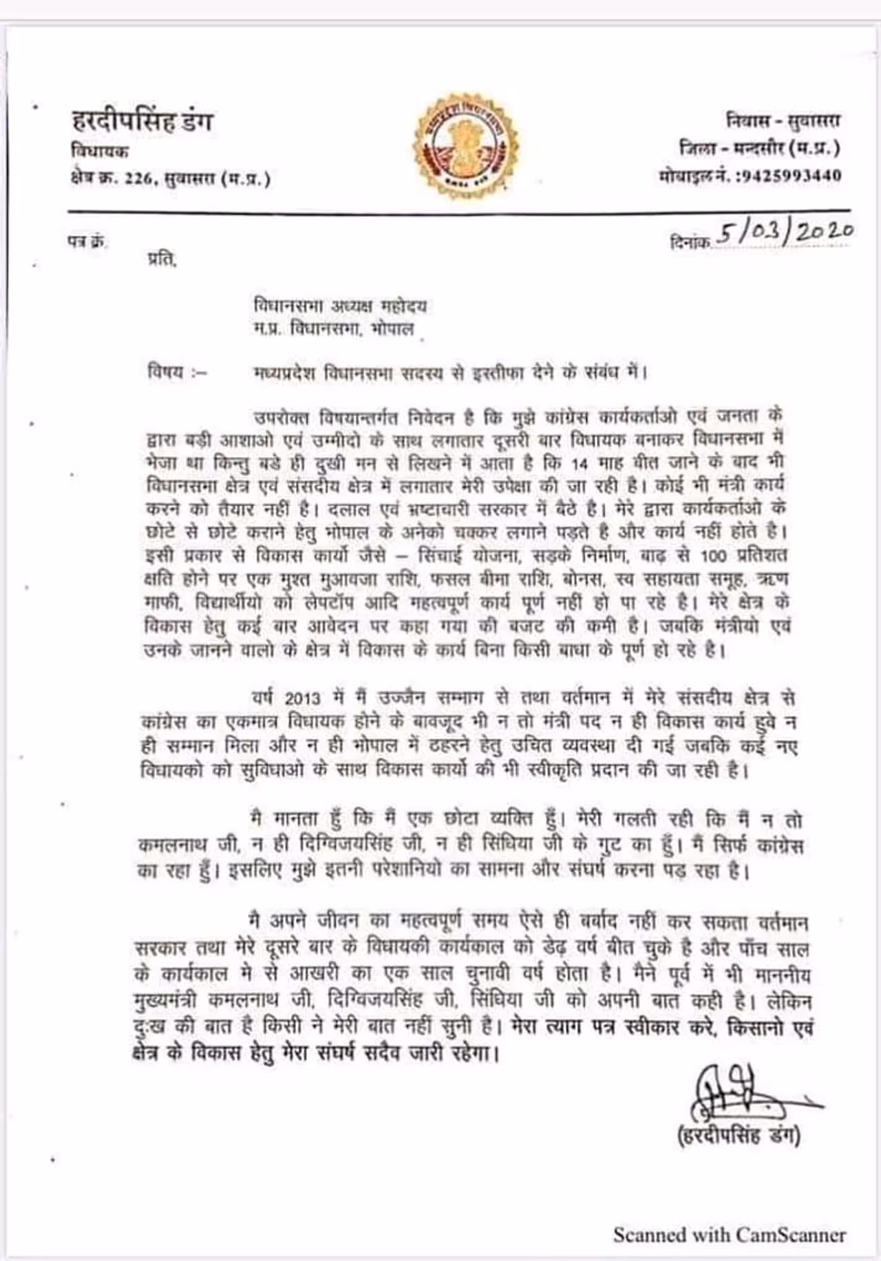 मंदसौर के सुवासरा से दूसरी बार विधायक बने हरदीप सिंह डंग ने इस्तीफे में लिखा, "सरकार बनने के 14 महीने बीतने के बाद भी मेरे विधानसभा क्षेत्र की उपेक्षा की जा रही है। मंत्री काम करने के लिए तैयार नहीं हैं। दलाल और भ्रष्टाचारी सरकार में बैठे हैं।" करीबियों की मानें तो डंग सरकार के मुआवजा वितरण के तरीके को लेकर नाराज थे। 19 फरवरी को सीतामऊ में हुए कर्जमाफी के दूसरे चरण के सम्मेलन में भी प्रभारी मंत्री हुकुमसिंह कराड़ा की मौजूदगी में ही डंग ने ऐलान किया था कि किसानों की समस्याएं नहीं सुनी जा रही हैं और इसके लिए मंदसौर में बड़ा आंदोलन किया जाएगा। डंग ने कश्मीर से अनुच्छेद 370 हटाए जाने का भी समर्थन किया था।