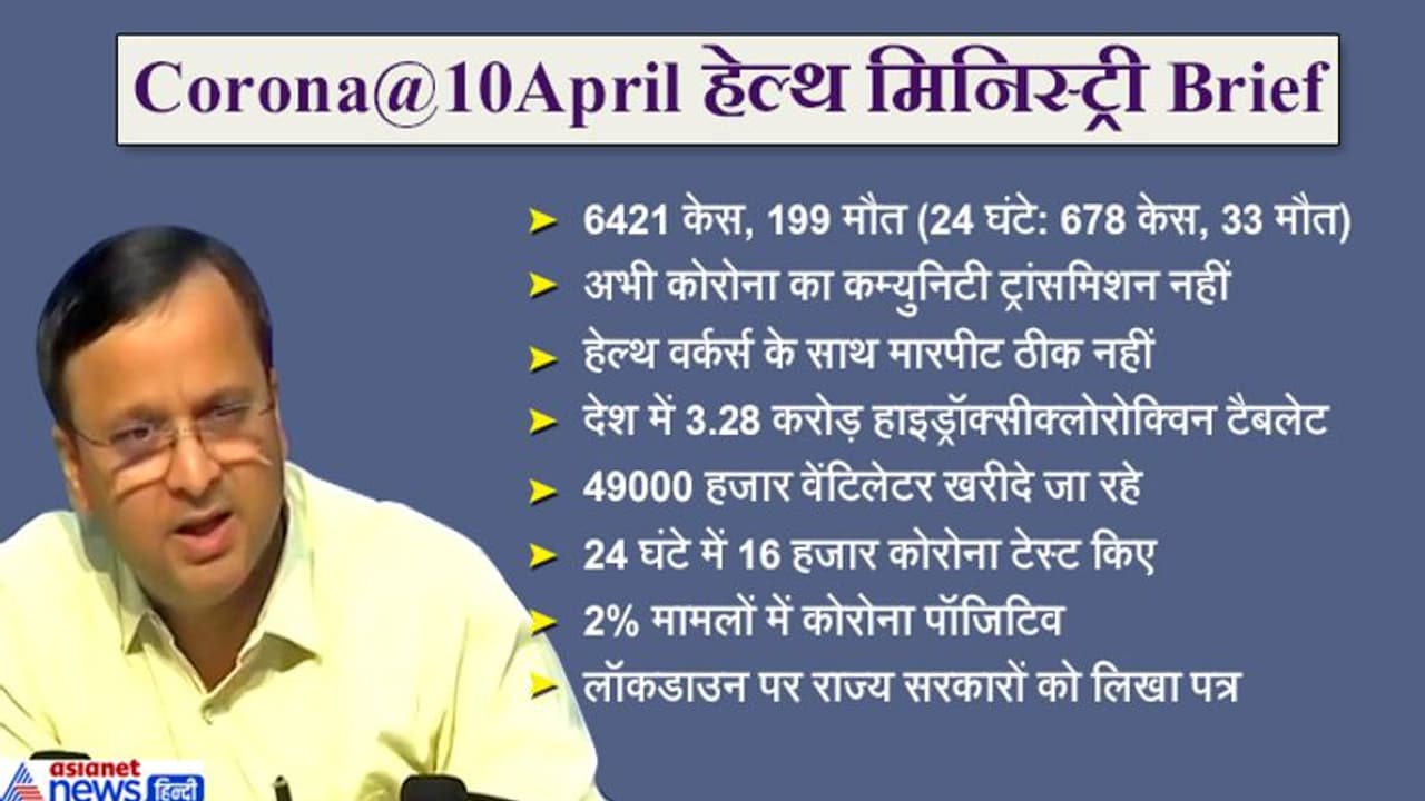 देश में कोरोना के कुल 6421 संक्रमित मरीज हो चुके हैं। स्वास्थ्य मंत्रालय के संयुक्त सचिव लव अग्रवाल ने बताय कि अभी तक 503 लोग ठीक हो चुके हैं। कल से आज तक 678 नए मामले सामने आए हैं। कुल 199 मौत हुई हैं, जिसमें से 33 मौत पिछले 24 घंटे में हुई है।